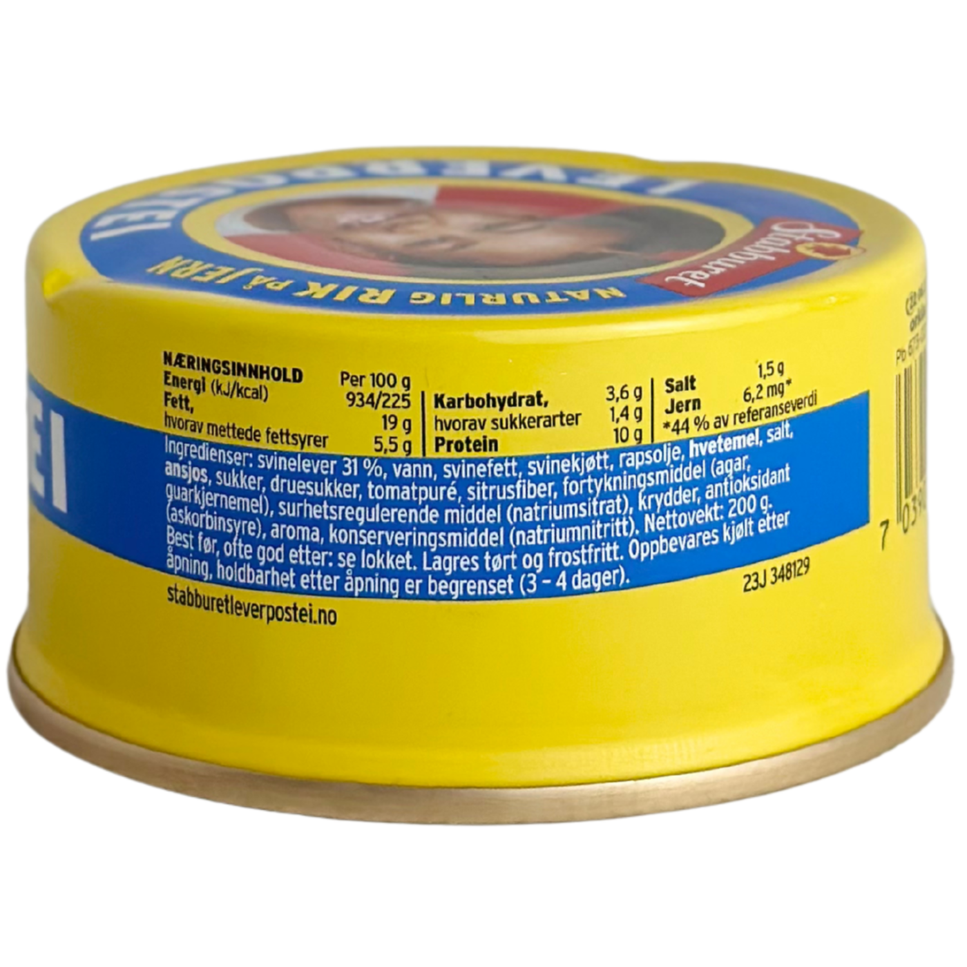 Паштет Stabburet виготовляється з свинячої печінки, свинячого жиру, цибулі, солі та спецій. Страва законсервована особливим способом, внаслідок чого продукт має м'яку та ніжну текстуру і довше зберігається. Ніжний печінковий паштет з запашними спеціями, відрізняється пряним ароматом та делікатним смаком. Продукт готовий до вживання. Паштет можна подавати як самостійну закуску із хлібом та овочами та французьким багетом. Також використовуйте його як інгредієнт у різних закусках і на пікніку.