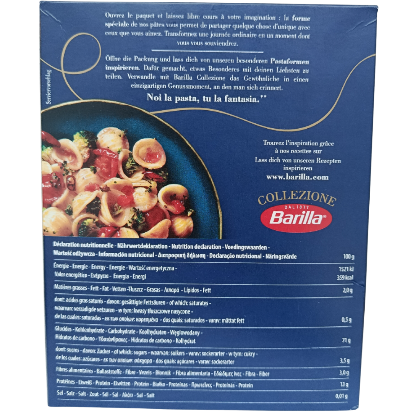 Паста Barilla Collezione Orecchiette - це високоякісні італійські макарони з твердих сортів пшениці, виготовлені за традиційною рецептурою. Маленькі макарони у формі «вушок» мають щільну текстуру і природний золотистий колір, завдяки чому вони добре тримають форму після варіння та рівномірно просочуються соусом. Orecchiette ідеально підходять для приготування густих соусів, овочевих страв, м’ясних соусів і класичних італійських рецептів, створюючи насичений смак і ефектну подачу на тарілці. Продукт не містить штучних барвників і консервантів, що робить його безпечним і смачним для щоденного використання вдома та в професійній кухні.