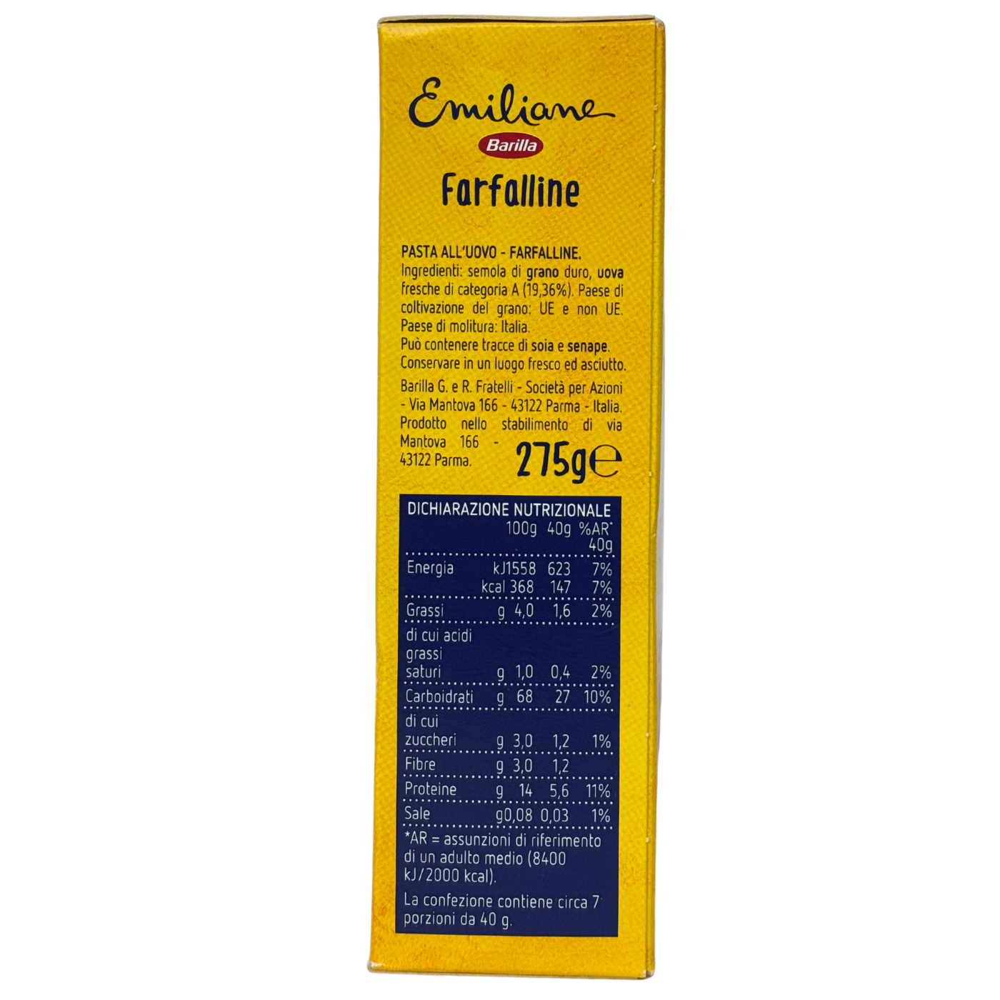 Паста фарфалліне Barilla Emiliane Farfalline all’uovo виготовлена з високоякісного яєчного тіста, що забезпечує ніжну текстуру та насичений смак після приготування. Вона швидко готується та підходить для супів, салатів, страв з соусами або гарнірів. Особлива форма фарфалліне додає стравам привабливий вигляд та зручна для рівномірного утримання соусів. Паста багата на білок і складні вуглеводи, що підтримують енергію та сприяють легкому травленню, роблячи її ідеальним вибором для щоденного раціону.