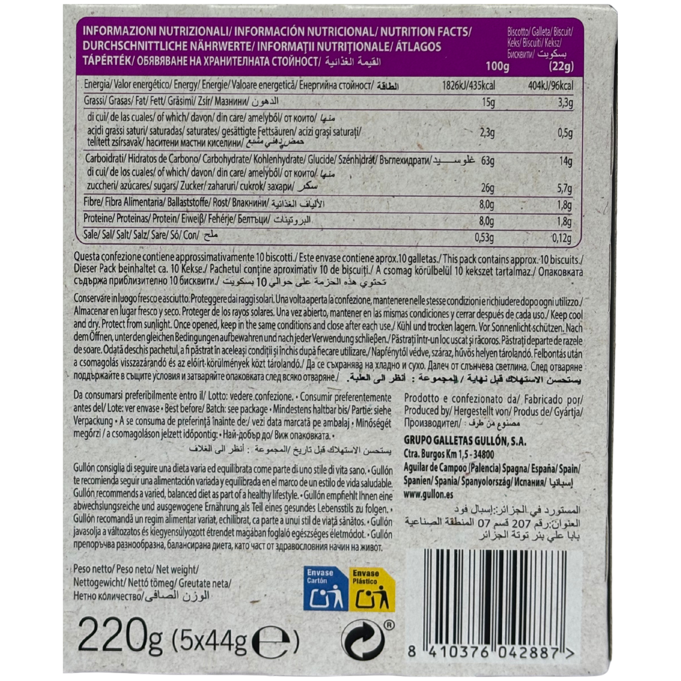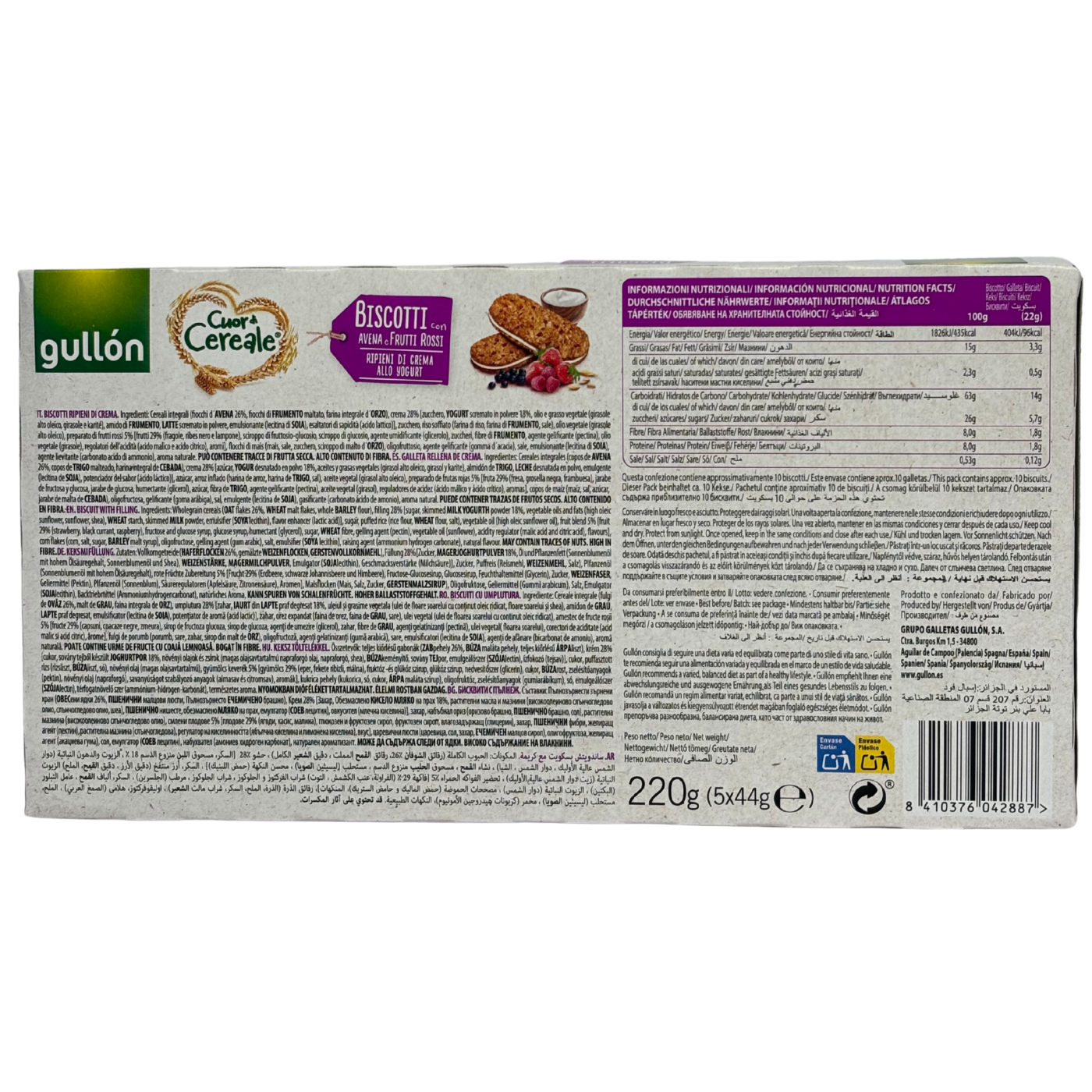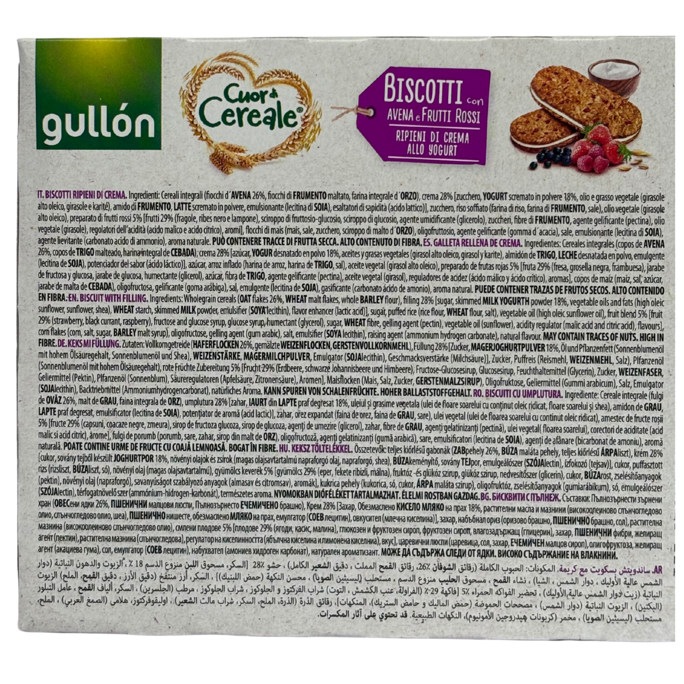 Печиво-сендвіч від Gullón – це надзвичайно якісний продукт, який містить шматочки ягід (малина, чорниця, ожина) та густий крем на основі йогурту. В ньому багато злаків, саме тому воно багате на клітковину, яка необхідна організму людини.