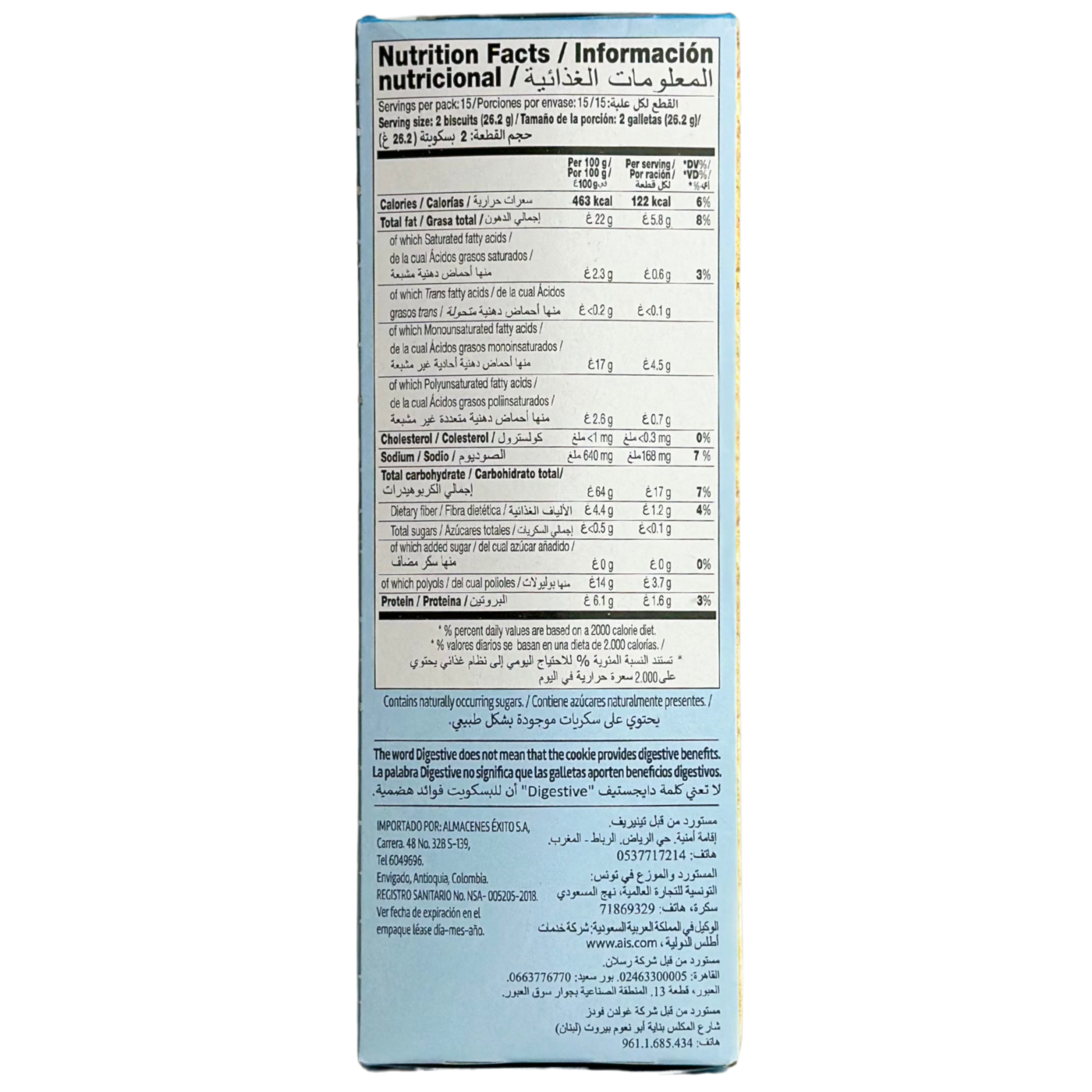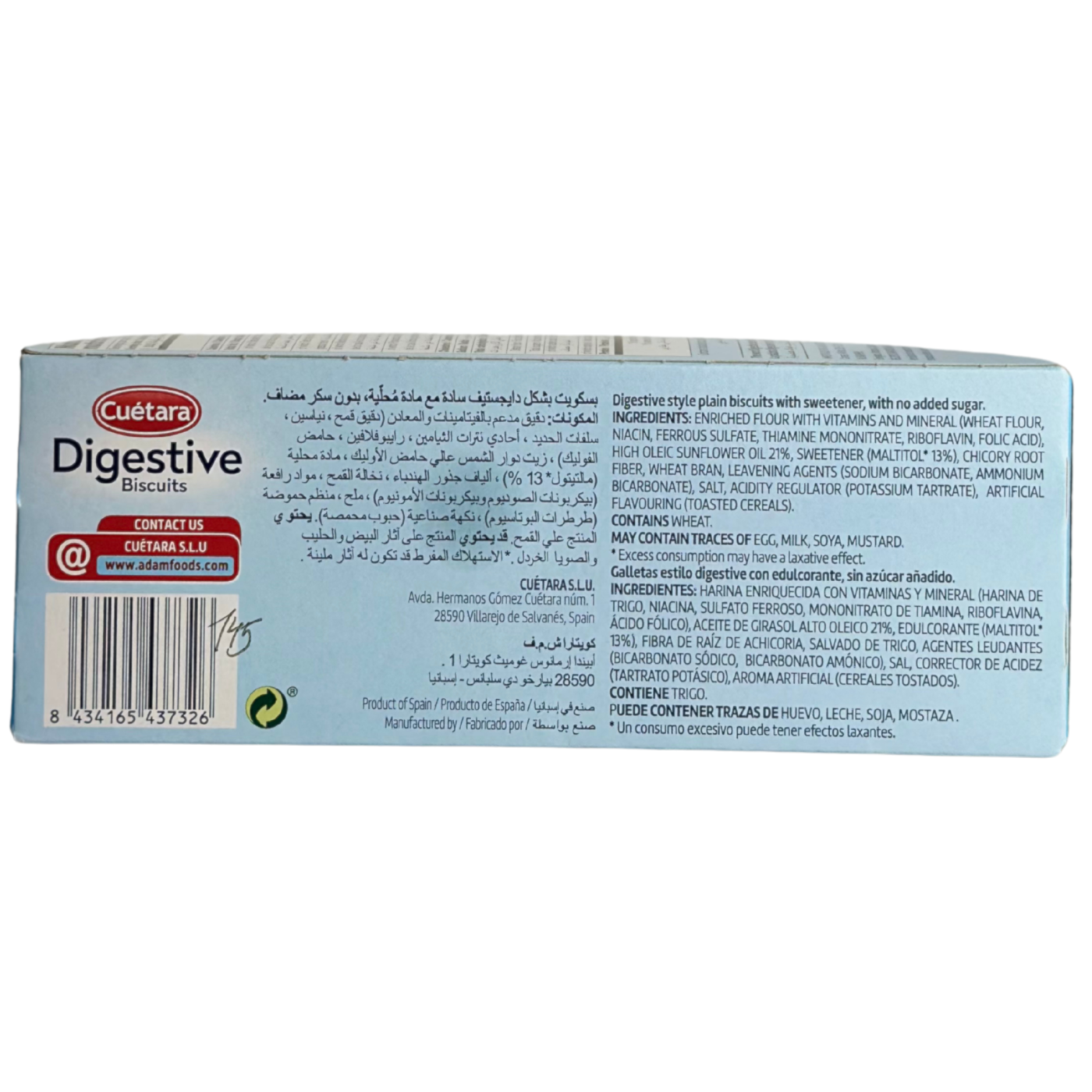 Печиво без цукру Digestive Biscuits Cuetara - виготовлене за класичною рецептурою з додаванням пшеничного борошна та клітковини, це печиво має приємну текстуру та ніжний смак, не містить доданого цукру, штучних барвників і консервантів. Ідеально підходить до чаю або кави, як корисний перекус упродовж дня. Підійде для людей, які дотримуються здорового способу життя або контролюють рівень цукру в раціоні.
