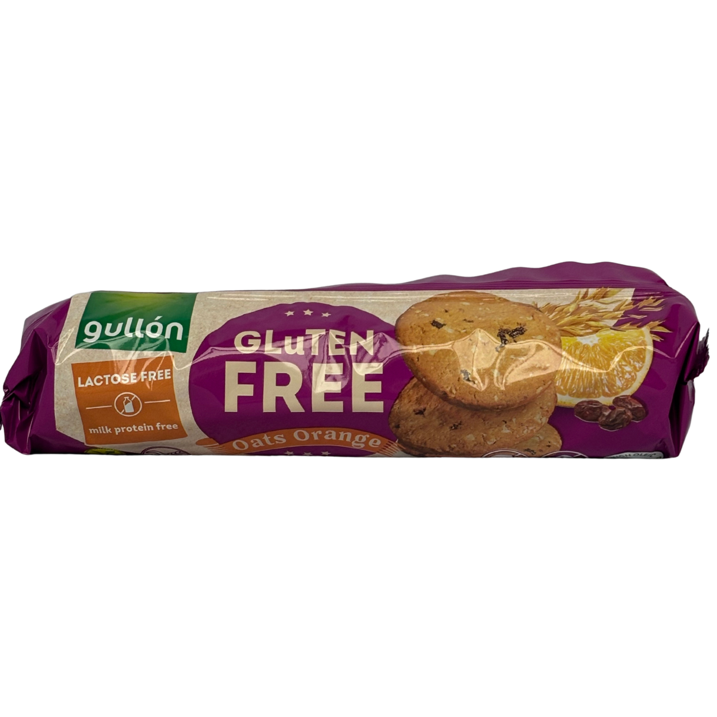 Хрустке печиво Гуллон з родзинками та апельсином має приємну розсипчасту текстуру та особливий смак з солодко-кислою ноткою. Продукт не містить глютену, лактози, горіхів, пшениці та яєць, а це означає, що він ідеально підходить людям, які мають алергію на перелічені продукти. Печиво багате на клітковину, яка вкрай важлива для організму людини, в складі також корисна високоолеїнова олія, яка за своїми властивостями подібна до оливкової олії.