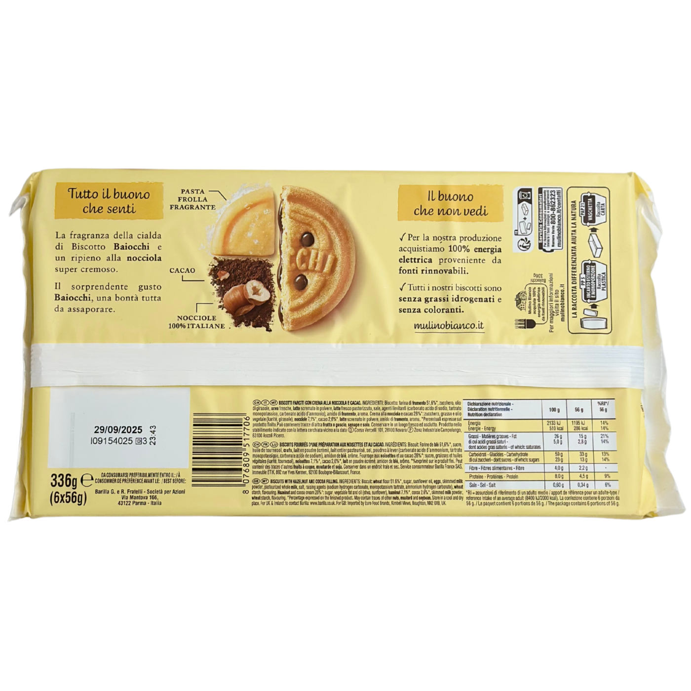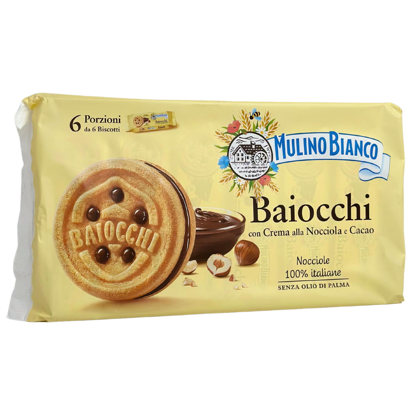 Печиво з фундучно-шоколадним кремом Baiocchi Mulino Bianco – це гармонійне поєднання хрусткого печива та насиченого крему, де солодкий шоколад і ароматний фундук створюють справжню симфонію смаку.