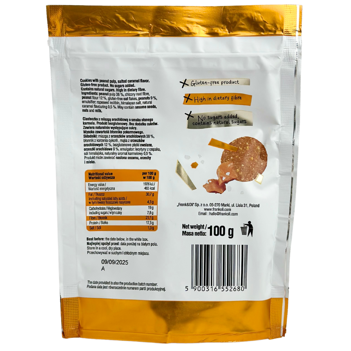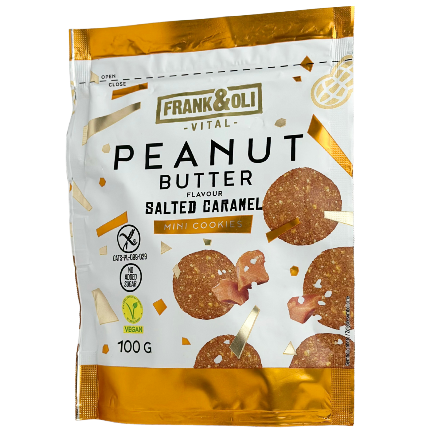 Печиво Mini Cookies Frank&Oli – це білковий десерт, де кремова м'якоть арахісу гармонійно переплітається з інтенсивними нотами соленої карамелі. Без цукру, для тих, хто обирає збалансований спосіб життя.