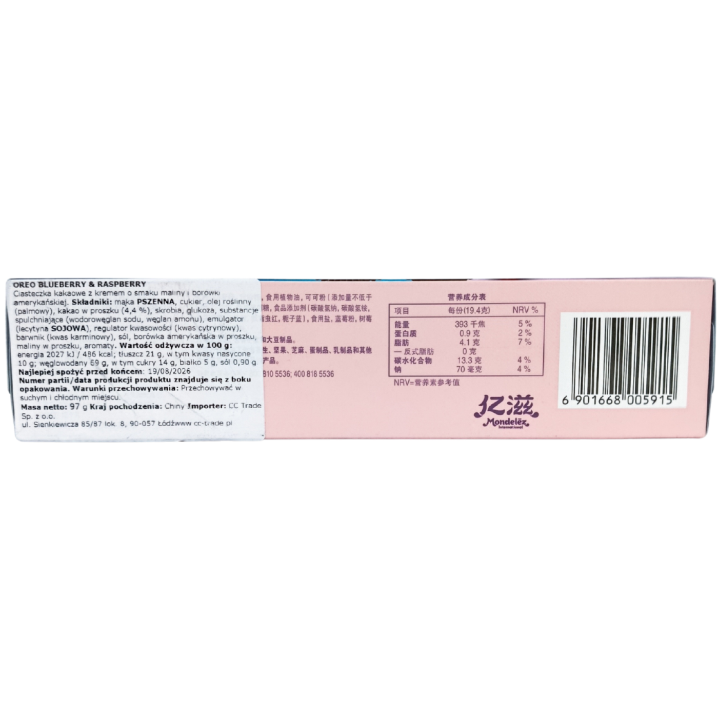 Дозвольте собі спробувати японське тонке печиво Орео, в якому поєднуються два класичні шоколадні печива з густим заварним кремом зі смаком чорниці та малини. Ідеальне поєднання ніжної малини та соковитої чорниці приємно здивує ваші смакові рецептори. В середині два окремі пакування, які зручно брати з собою в дорогу чи на прогулянку і насоджуватися неповторним смаком печива Орео.