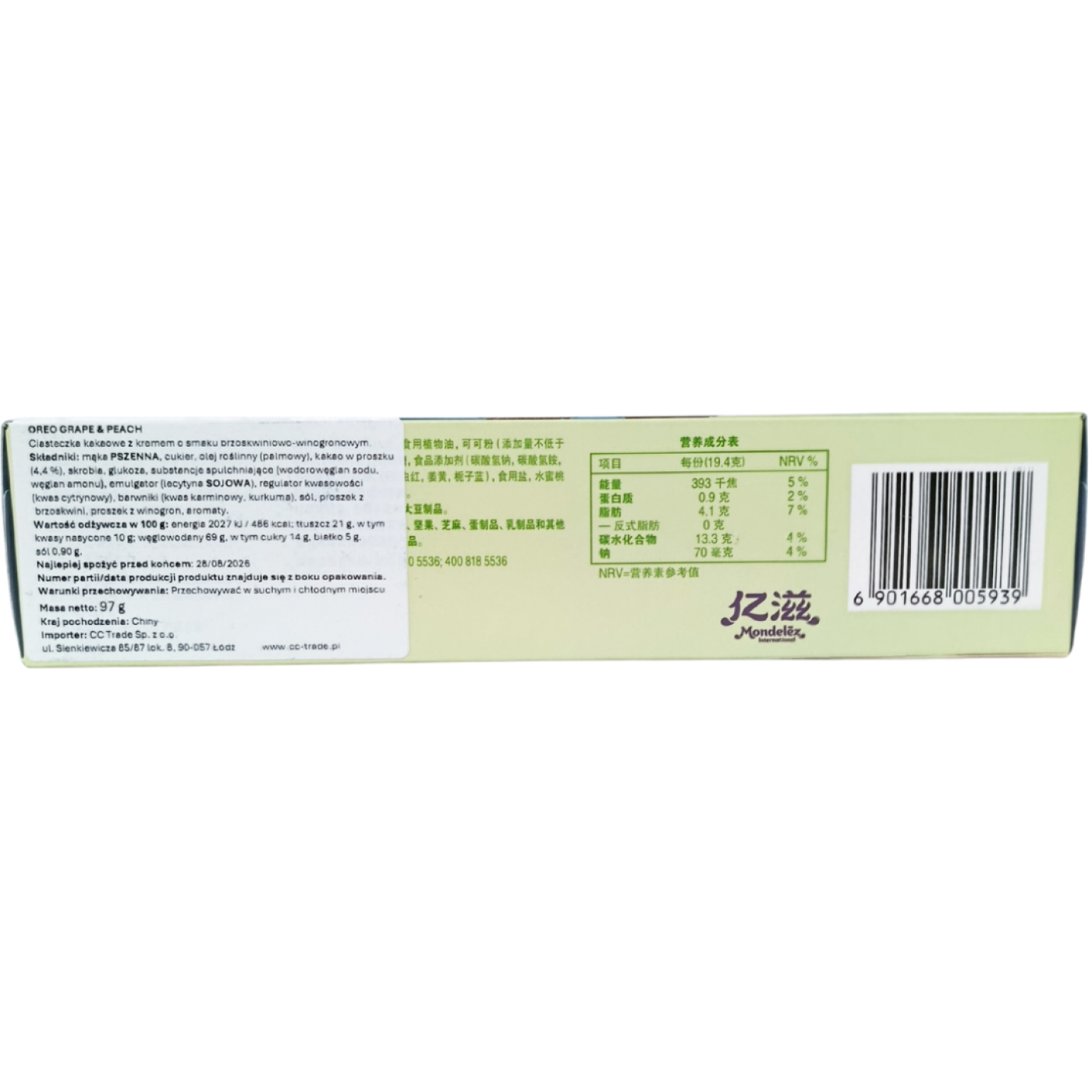 Подаруйте собі насолоду, смакуючи японське ультратоке печиво зі смаком зеленого винограду та рожевого персика. Неймовірне поєднання шоколаного хрусткого печива та шовкового подвійного крему , який має освіжаючий та неповторний смак, не залишить осторонь нікого, хто його спробував. Беріть улюблене печиво-сендвіч з собою на роботу, на прогулянку чи смакуйте з друзями, ажде всередині упаковки є два індивідуальні пакування.