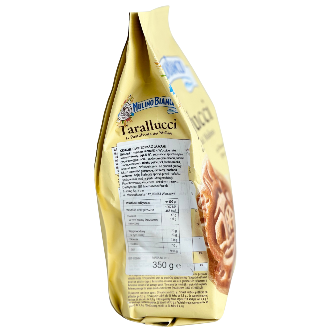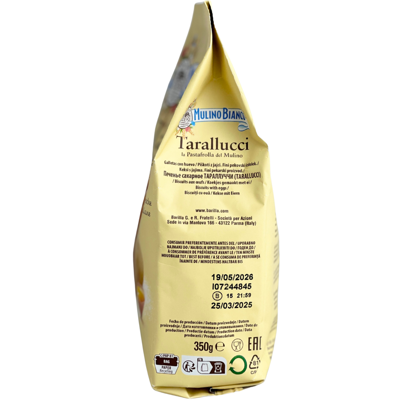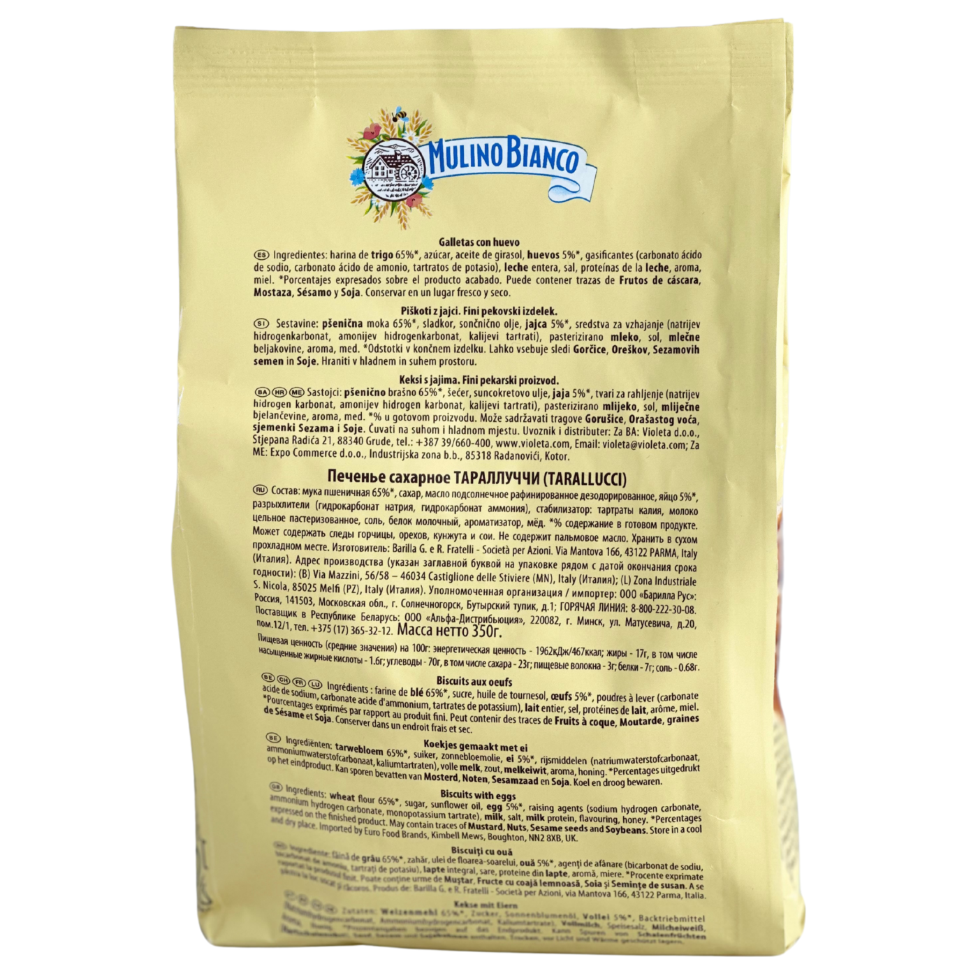Пісочне печиво Taralucci з серії Mulino Bianco – це якісний продукт від італійського виробника, який виготовлений з додаванням свіжих яєчних жовтків. Воно не містить пальмової олії, а вміст насичених жирів на 65% нижчий, ніж в схожому печиві від інших виробників.