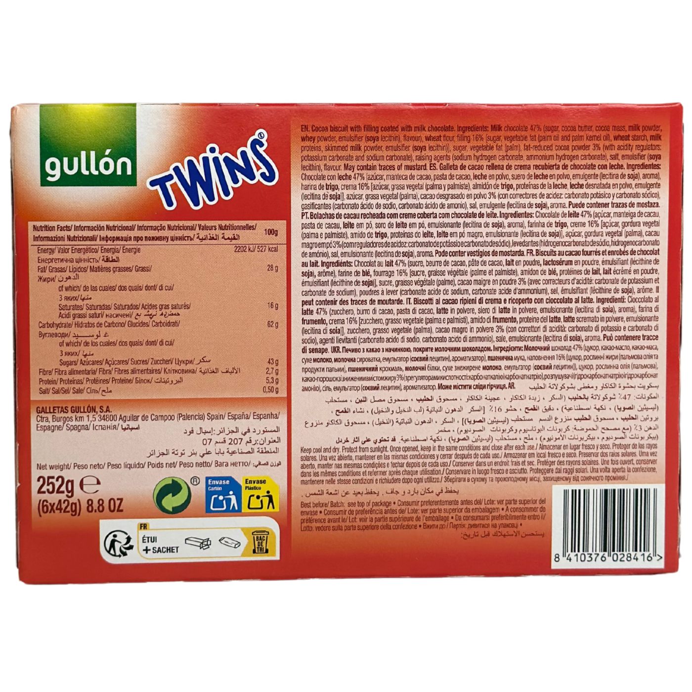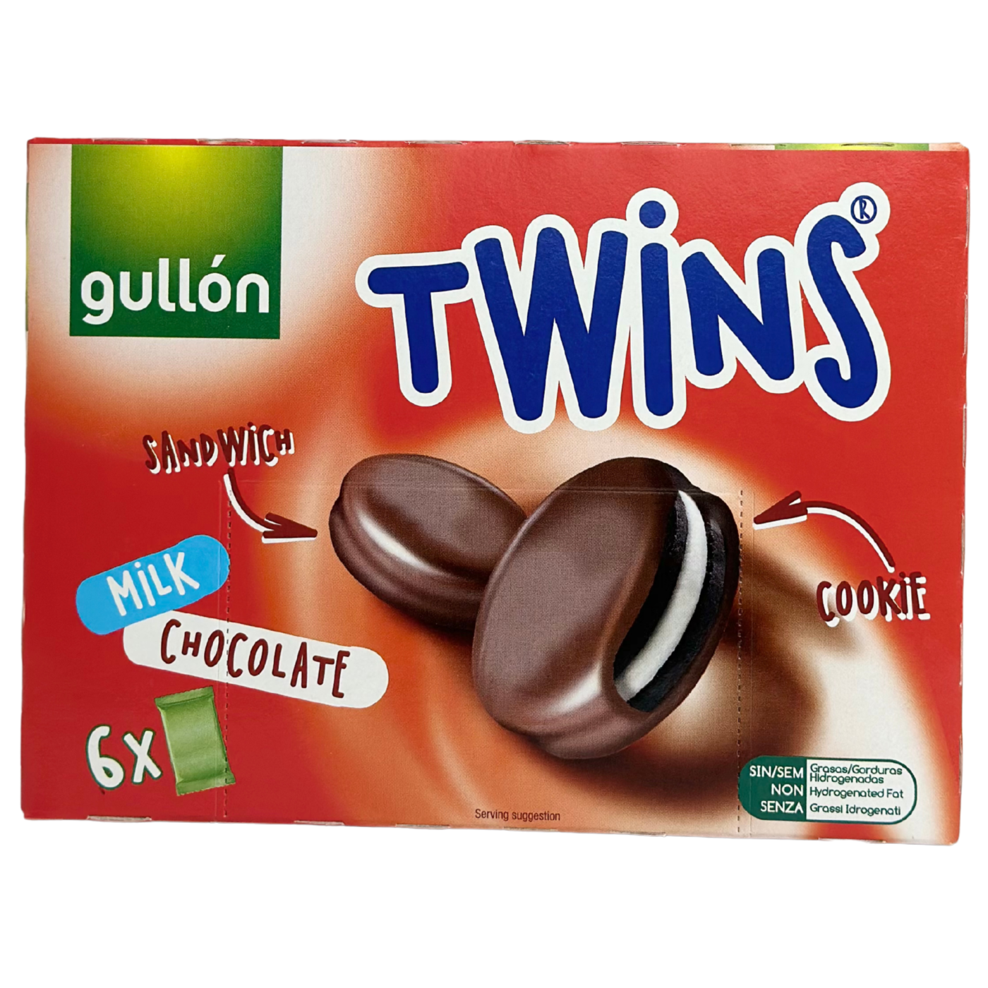 Twins Gullón — смачне шоколадне печиво з ніжною молочною начинкою, покрите апетитною глазур’ю. Ідеальне поєднання хрусткого печива, кремової серединки та шоколаду створює яскравий смак, від якого неможливо відмовитись.