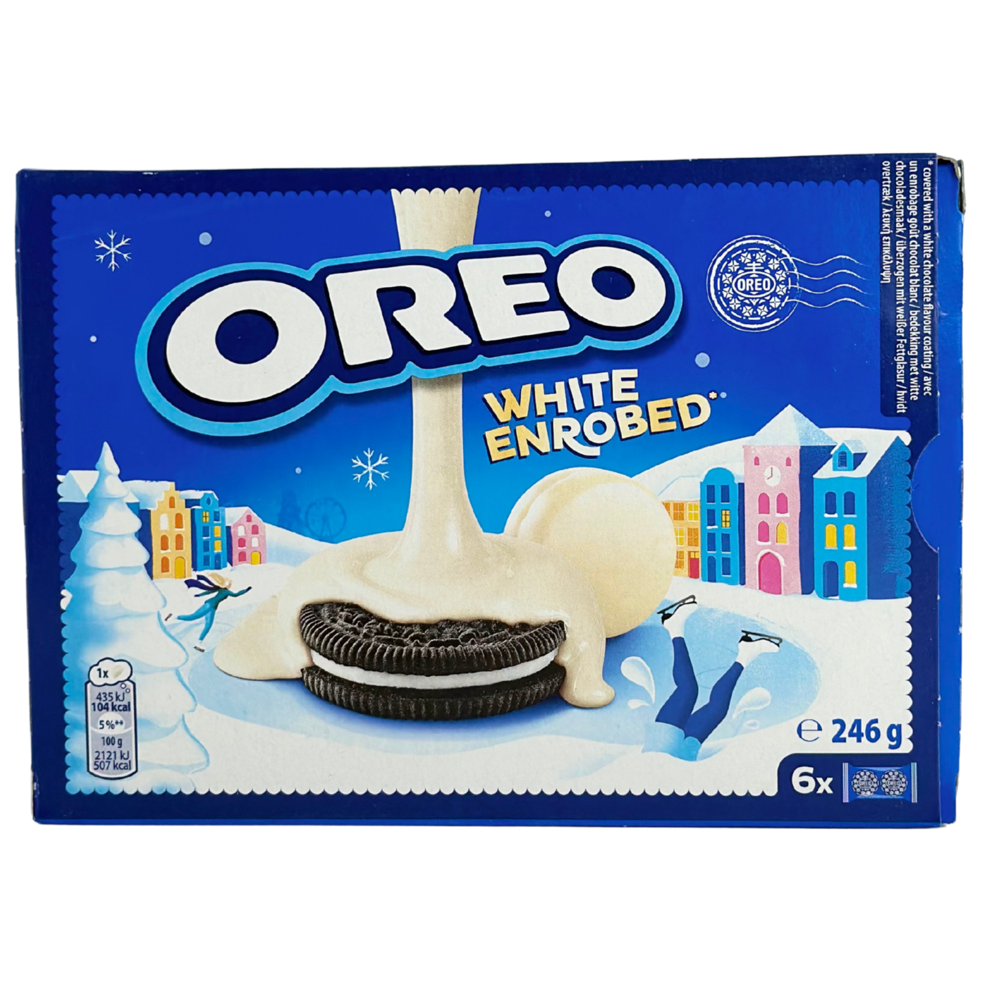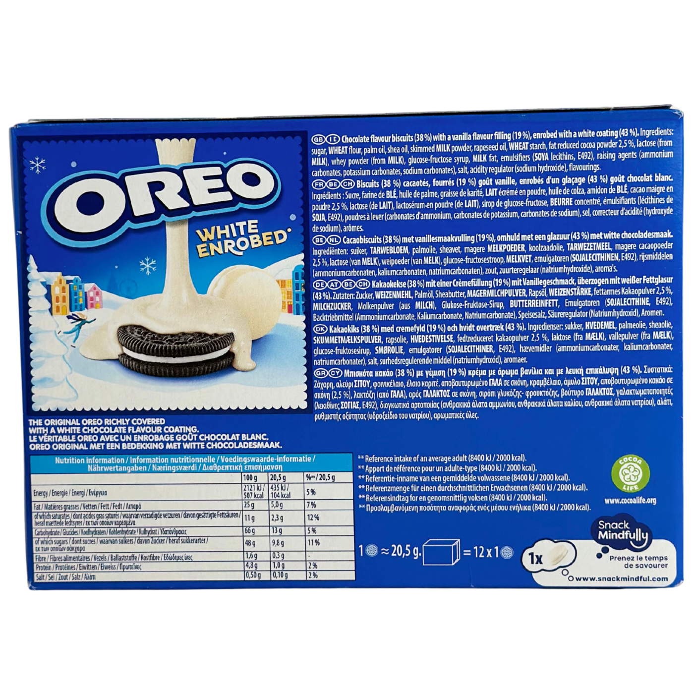 Печиво Oreo Bañadas White Chocolate - це унікальне поєднання класичного хрусткого шоколадного печива Oreo з кремовою начинкою, повністю занурене у товстий шар глазурі з високоякісного білого шоколаду. Ці ласощі пропонують насичений контраст між традиційною темною основою Oreo та солодким, вершковим білим шоколадом. Завдяки вакуумному пакуванню, печиво залишається свіжим і хрустким, ідеальним для особливих моментів насолоди, святкового столу або як преміальний подарунок для шанувальників Oreo.