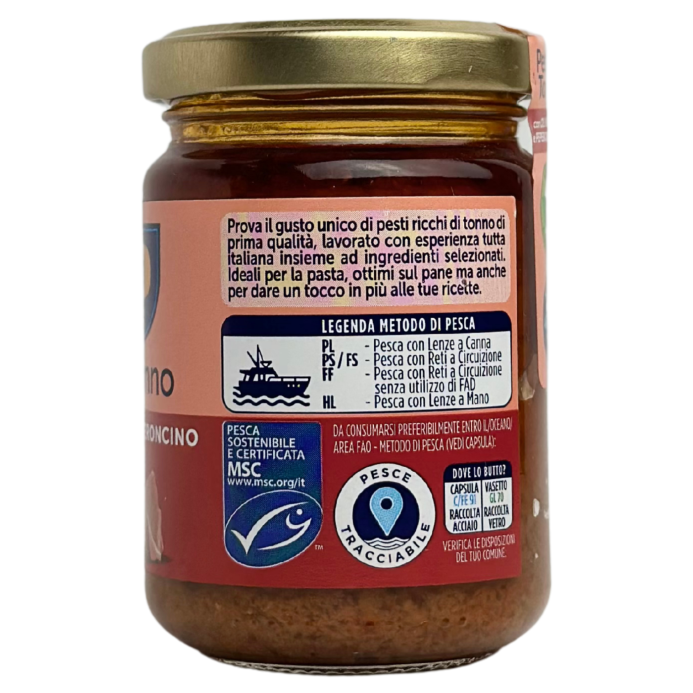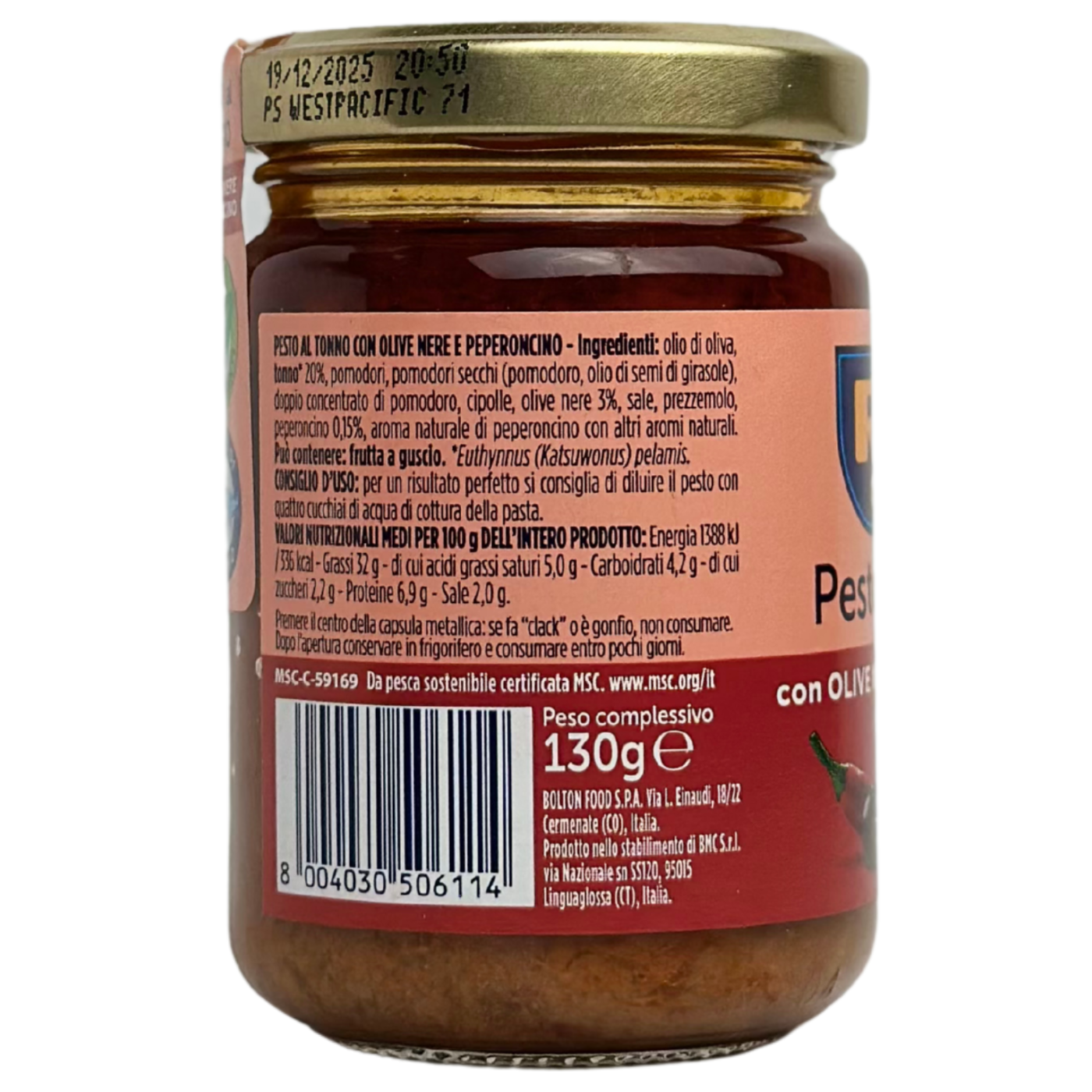 Песто з тунця Rio Mare з чорними оливками та пеперончіні - витончений соус у середземноморському стилі. Ніжний тунець розкривається глибокими, злегка солонуватими нотами чорних оливок, а пеперончіні додає делікатної пікантності, не перебиваючи основний смак. Текстура соусу оксамитова й насичена, що робить його ідеальним доповненням до пасти, брускет, морепродуктів та авторських закусок.