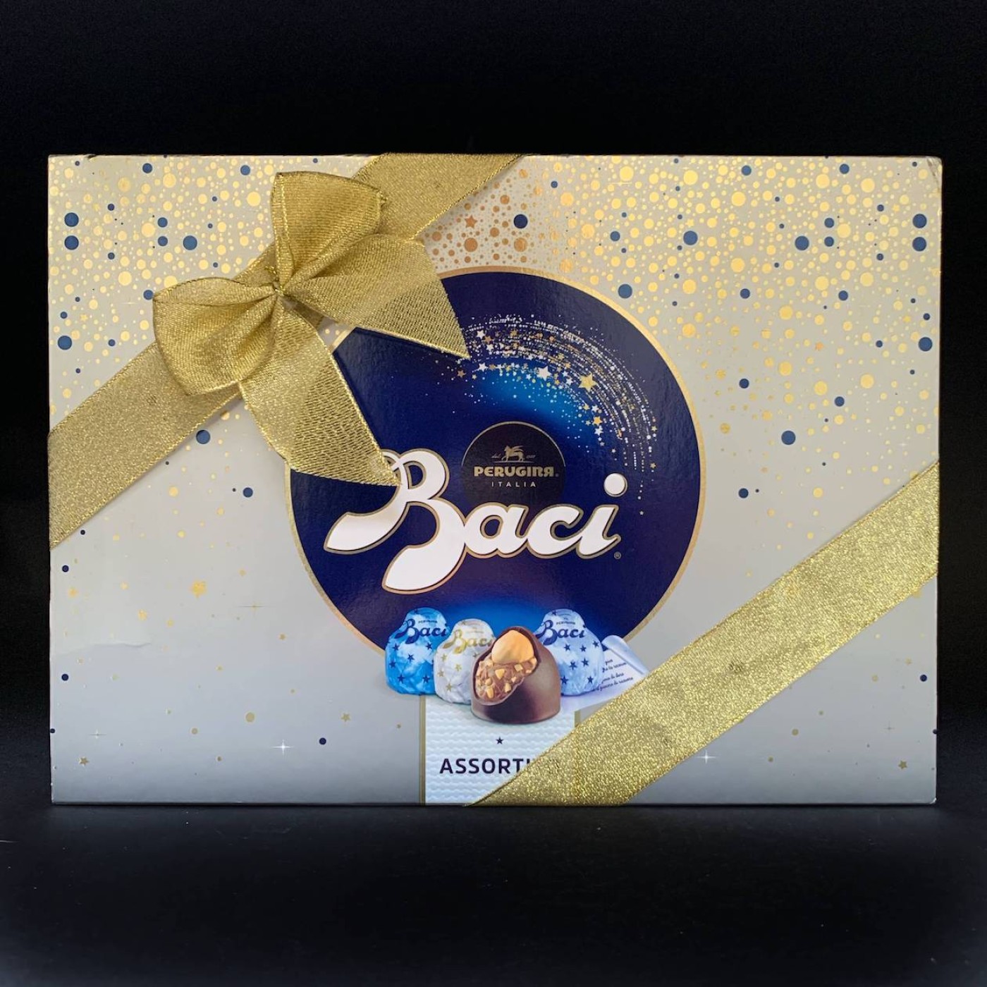 Що може бути кращим за коробку смачних та якісних цукерок? Особливо, якщо вона обмотана вишуканою золотою стрічкою з бантом. Італійський виробник Baci пропонує асорті з трьох видів цукерок з цільним фундуком та дрібними шматочками горіхів: Latte – молочний шоколад, Classico – темний шоколад і Bianco – білий шоколад. Цукерки запаковані індивідуально, вони мають дивовижний та насичений смак.