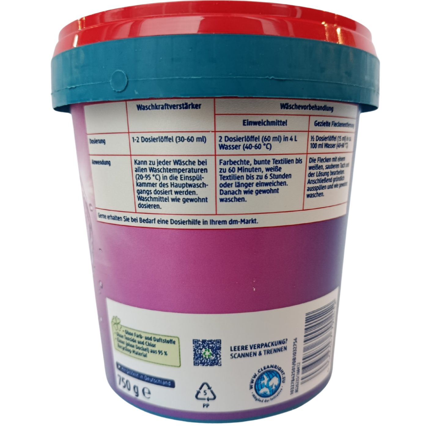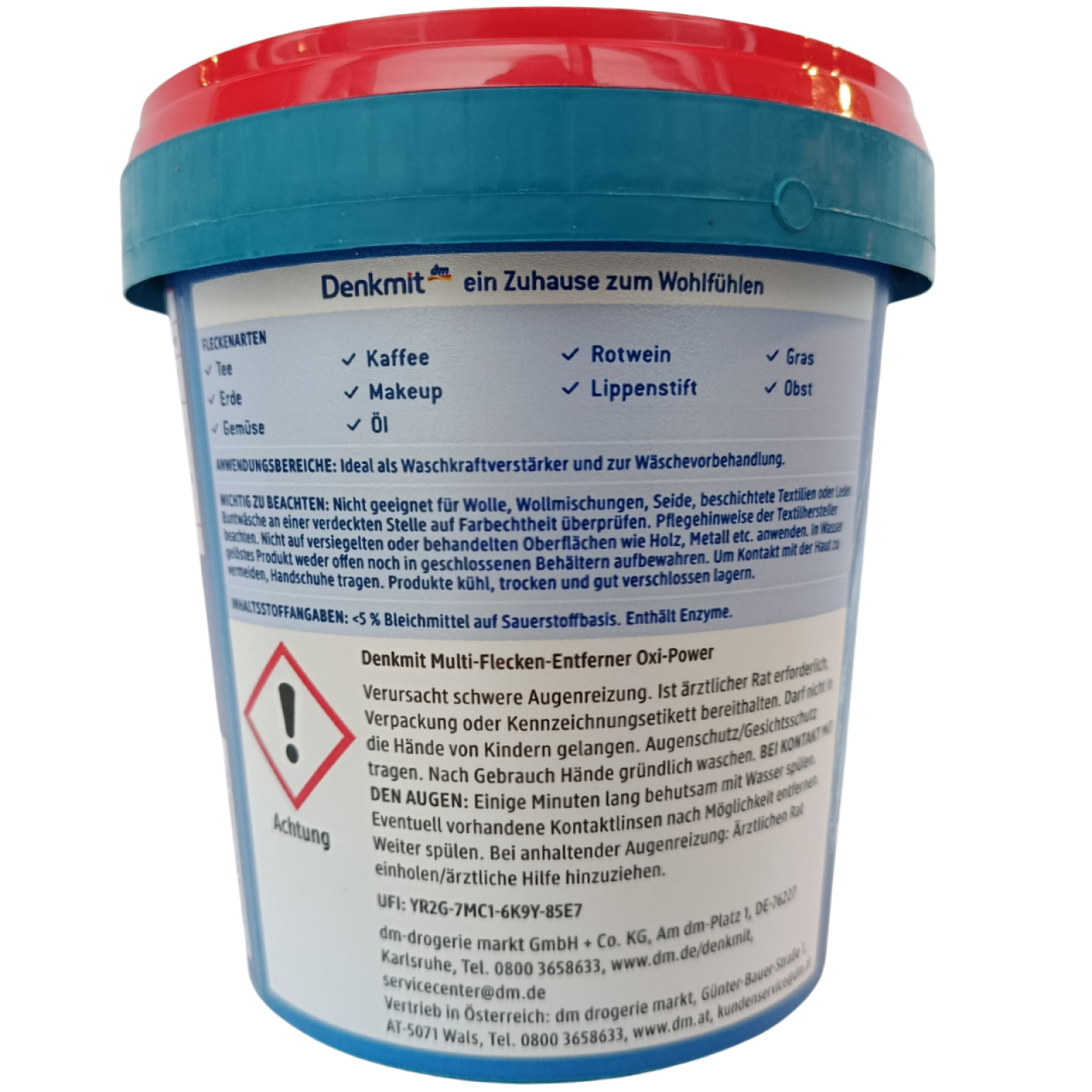 Multi-Flecken-Entferner Oxi Power – потужний плямовивідник від Denkmit, який містить активний кисень, тому легко видалить навіть застарілі і важкі плями, не пошкоджуючи тканину. Його використовують в якості додатку до основних миючих засобів, що ще більше посилює дію. В залежності від забруднення, додайте 1-2 мірні ложки плямовивідника під час звичного циклу прання.