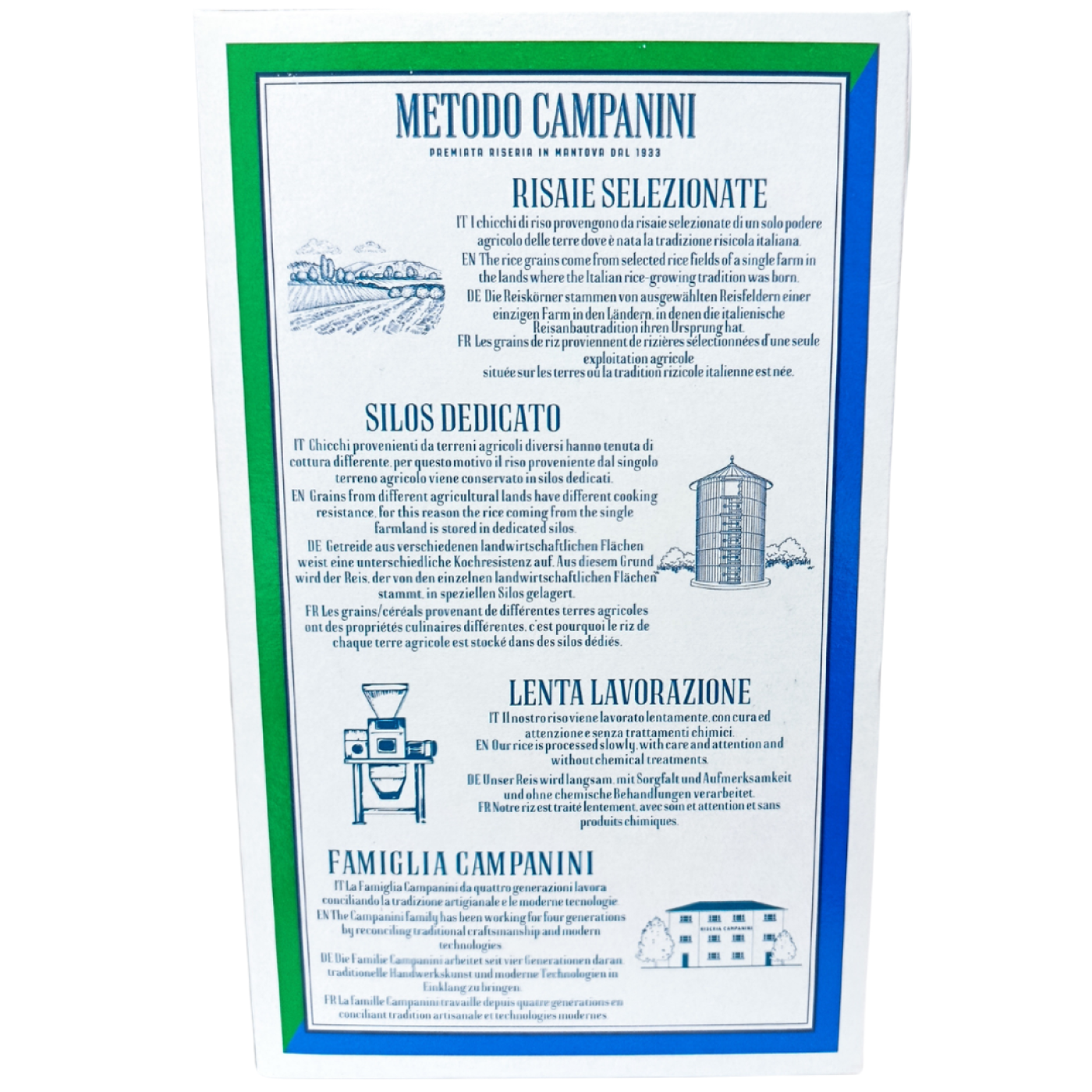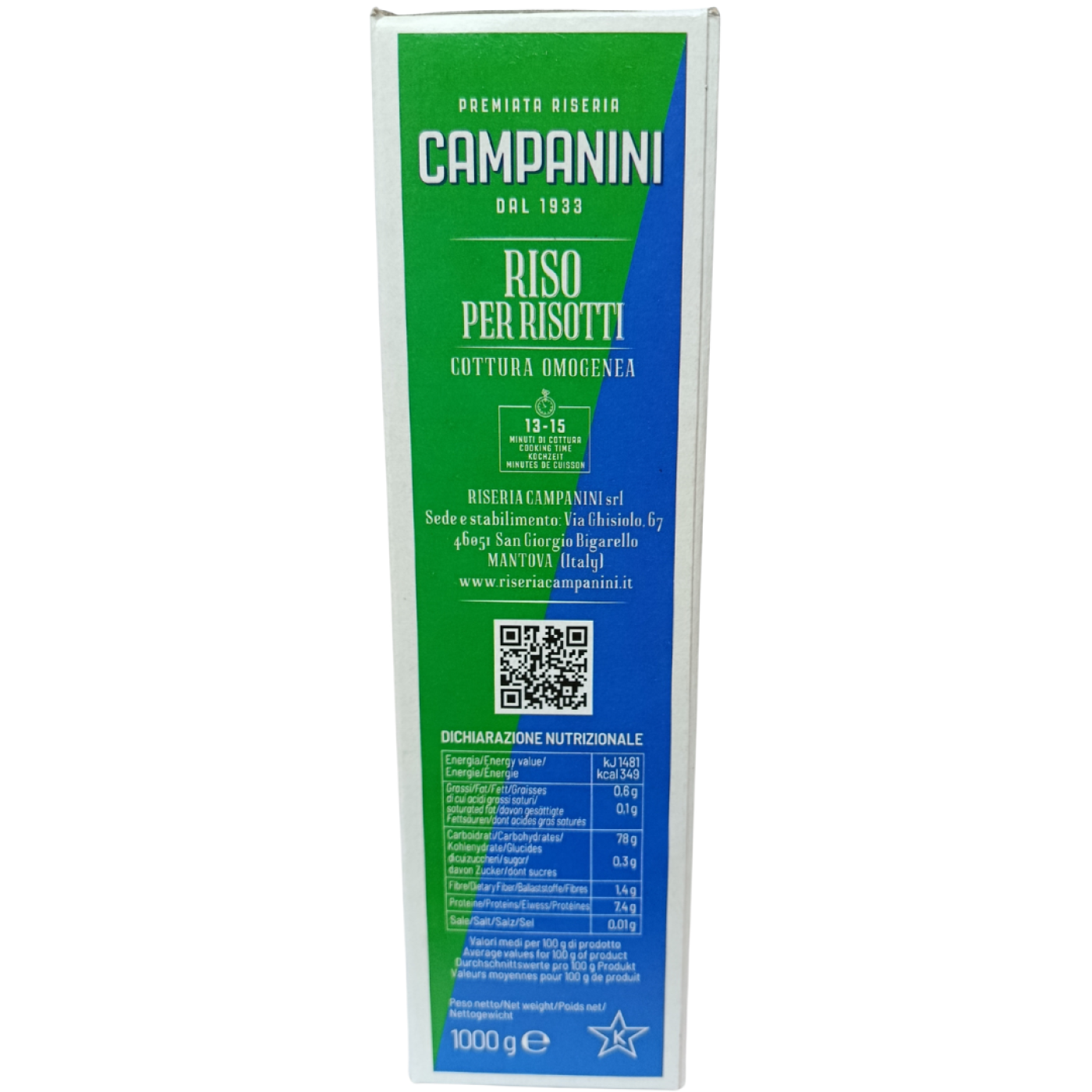 Рис Campanini Riso Per Risotti - високоякісний італійський рис, спеціально відібраний для приготування класичного різотто з кремовою текстурою та насиченим смаком. Виготовлений з добірних зерен рису, які добре вбирають рідину і зберігають форму під час приготування. У складі: 100% натуральний шліфований рис без добавок і консервантів. Рис є джерелом складних вуглеводів, забезпечує організм енергією, містить рослинний білок, клітковину, а також вітаміни групи B і мінерали, такі як магній і фосфор. Ідеально підходить для приготування різотто, гарнірів і страв італійської кухні