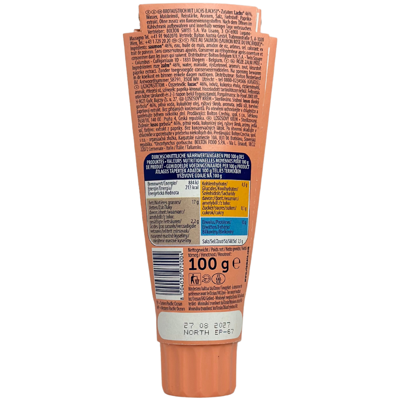 Pate Salmone Rosa – це ніжний паштет з лосося з насиченим ароматом та кремовою текстурою. Завдяки зручній упаковці його легко зберігати в холодильнику, аби ви могли довго насолоджуватись смаком. Продукт особливо припаде до смаку любителям риби та морепродуктів. Паста Ріо Маре смакуватиме з хлібом, крекерами, тостами, а також з його допомогою ви можете приготувати смачну закуску, наприклад фаршировані яйця.