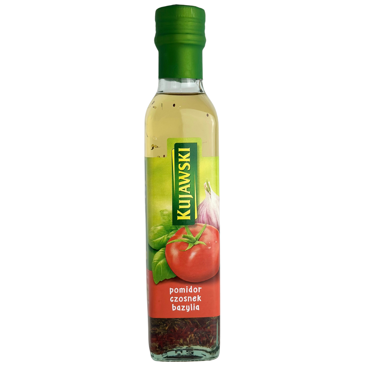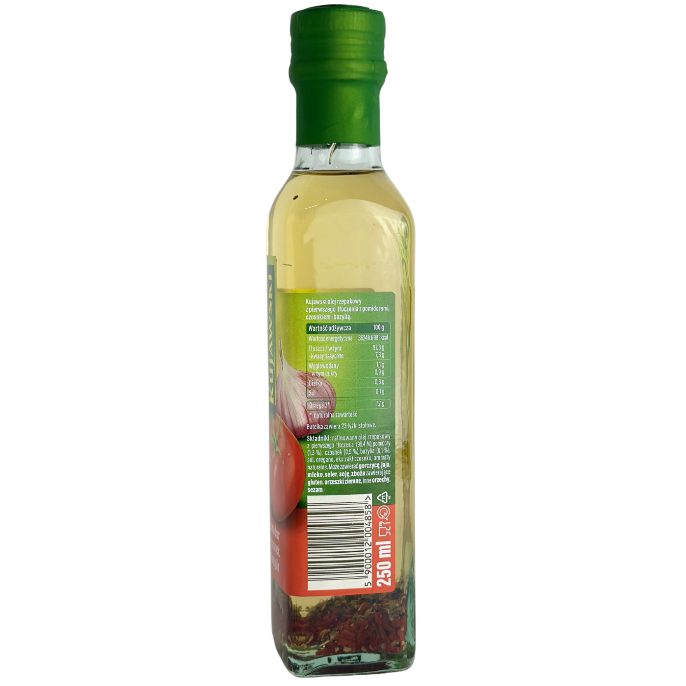 Ріпахова олія з томатами, часником і базиліком 250 мл Kujawski — це смачна та ароматна олія, яка поєднує в собі багатий смак ріпахової олії з нотками стиглих томатів, часнику та свіжого базиліку. Ідеально підходить для приготування різних страв, додаючи їм неповторний аромат і смак.
