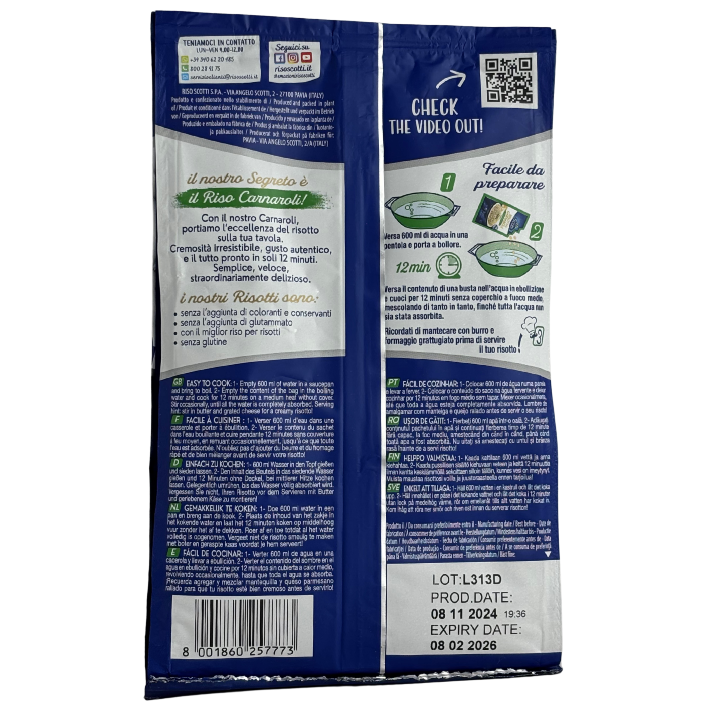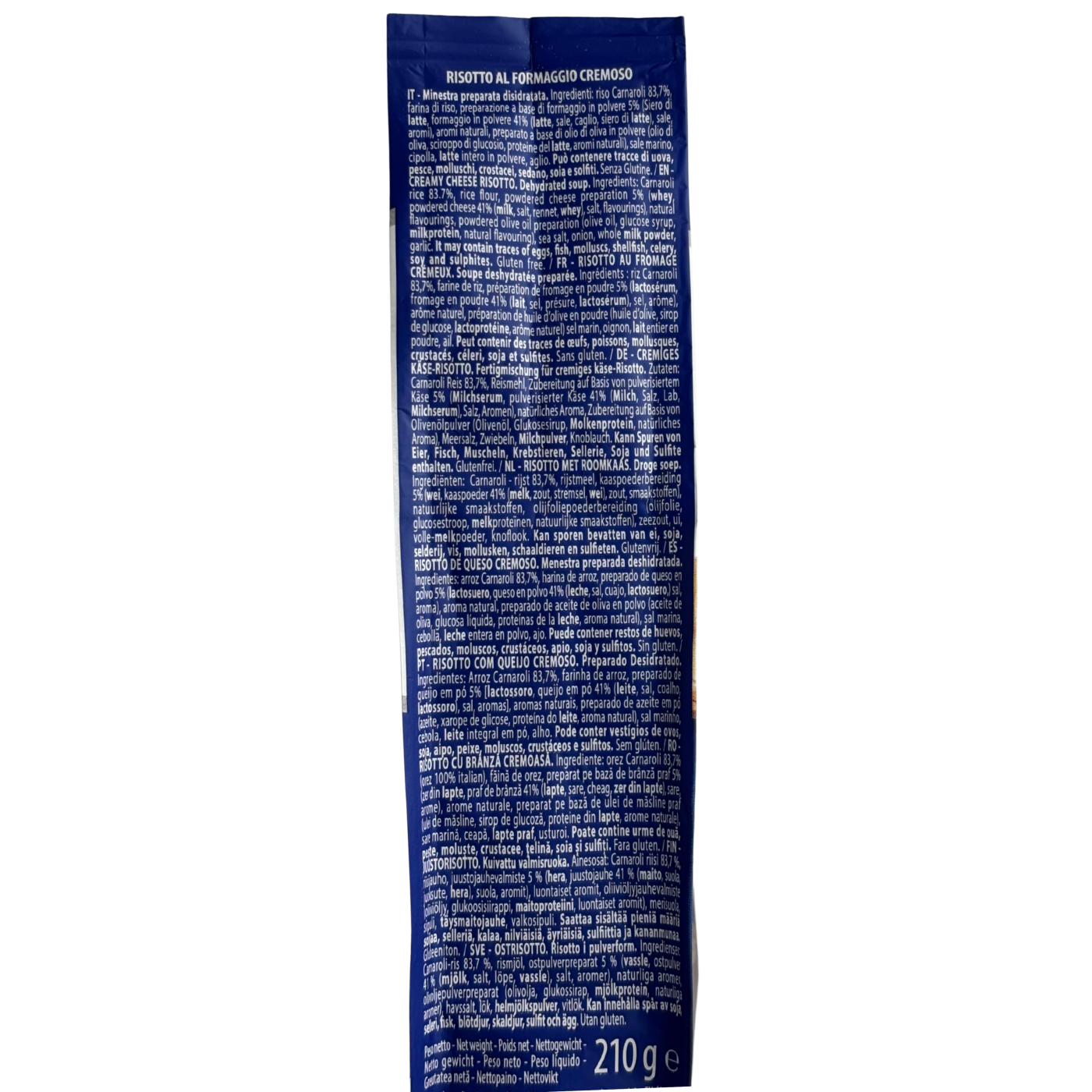 Різотто з пармезаном Risotto Parmigiana Scotti - це суха суміш для приготування кремового різотто. У складі: рис Carnaroli, сир Пармезан у порошку, молочні інгредієнти, цибуля, сіль та натуральні ароматизатори, які забезпечують насичений смак і ніжну текстуру готової страви. Достатньо додати воду і приготувати за кілька хвилин, щоб отримати готове ароматне різотто.