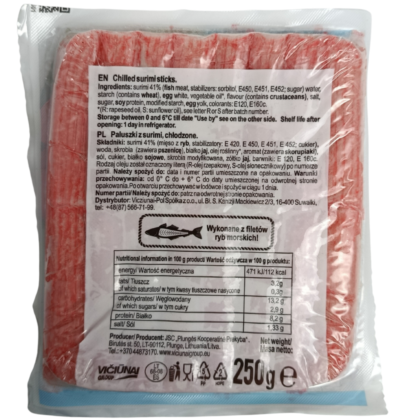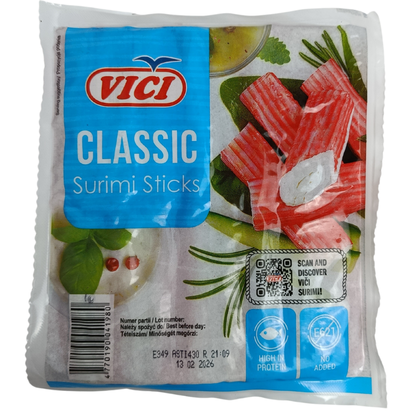 Крабові палички, виготовлені з подрібненого рибного філе (surimi) зі спеціальними добавками для смаку й текстури. Вони мають привабливий ніжний смак із легкою крабовою ноткою і м’яку, але щільну структуру, що добре тримає форму після розморожування. Ці палички чудово підходять як готовий продукт для салатів, закусок, суші, ролів або швидких бутербродів, а також як самостійна закуска — їх не потрібно довго готувати і можна вживати одразу після розморожування.