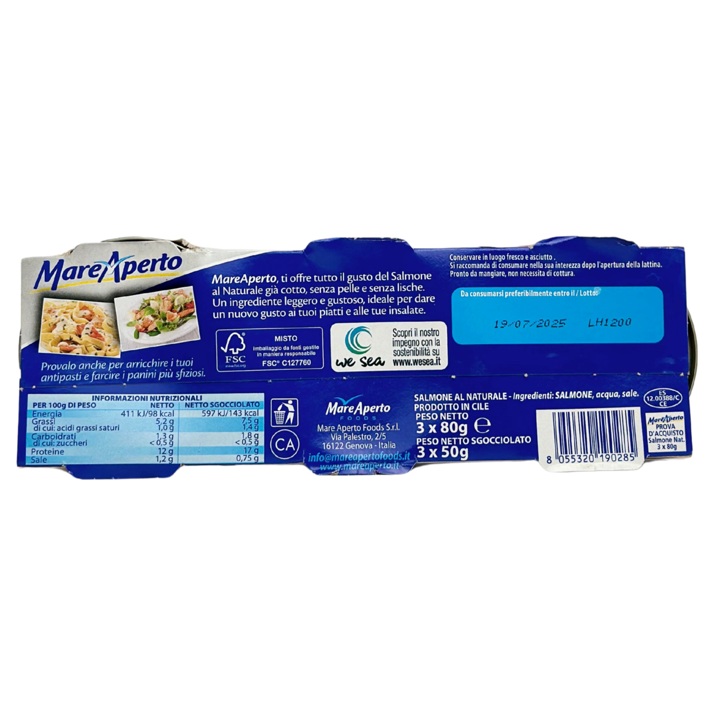 Шматочки лосося у власному соці без шкіри та кісток іспанського виробника Mare Aperto. Ця риба збагачена жирними кислотами Омега 3, які підтримують функції головного мозку та серця. З консервованого лосося готують багато різних страв.