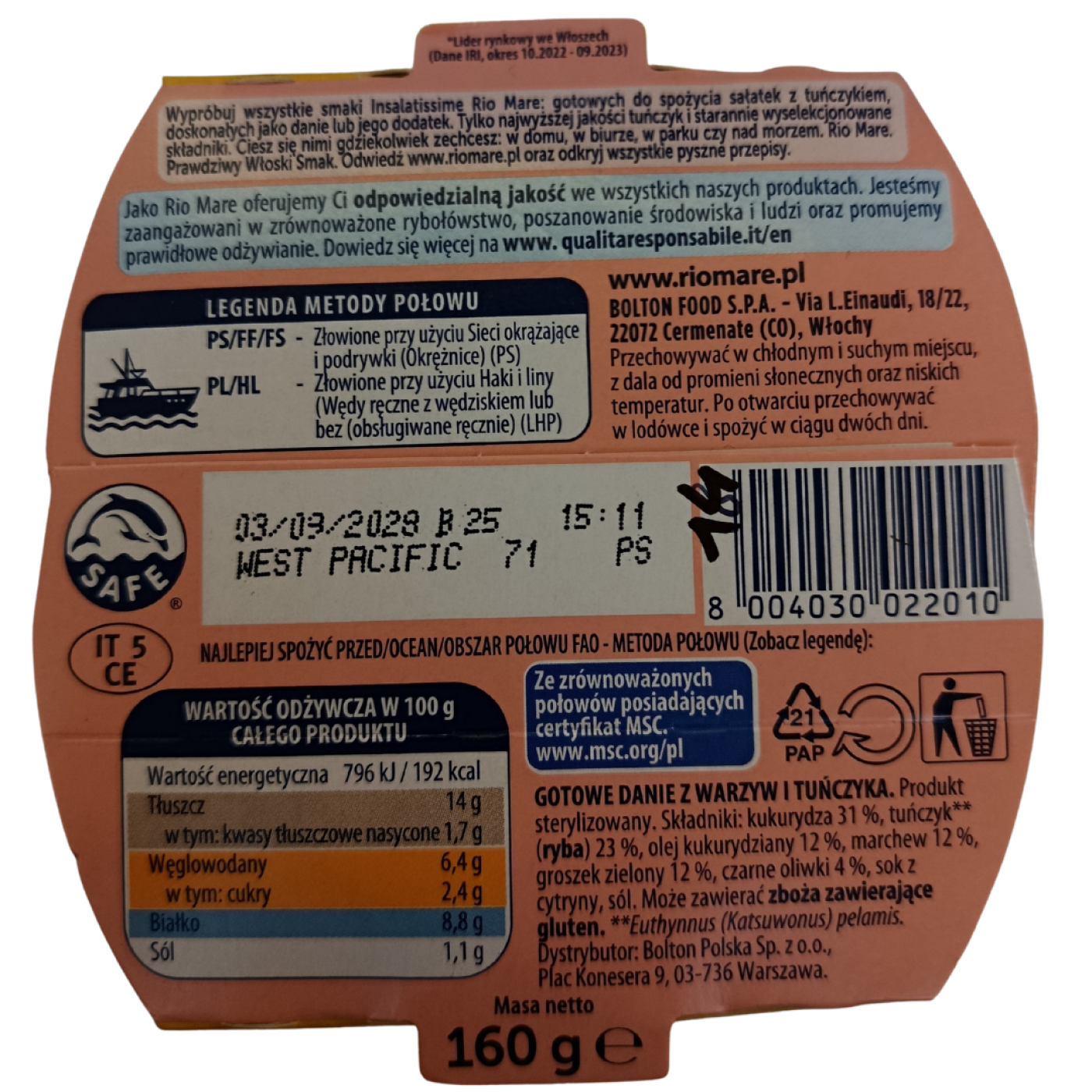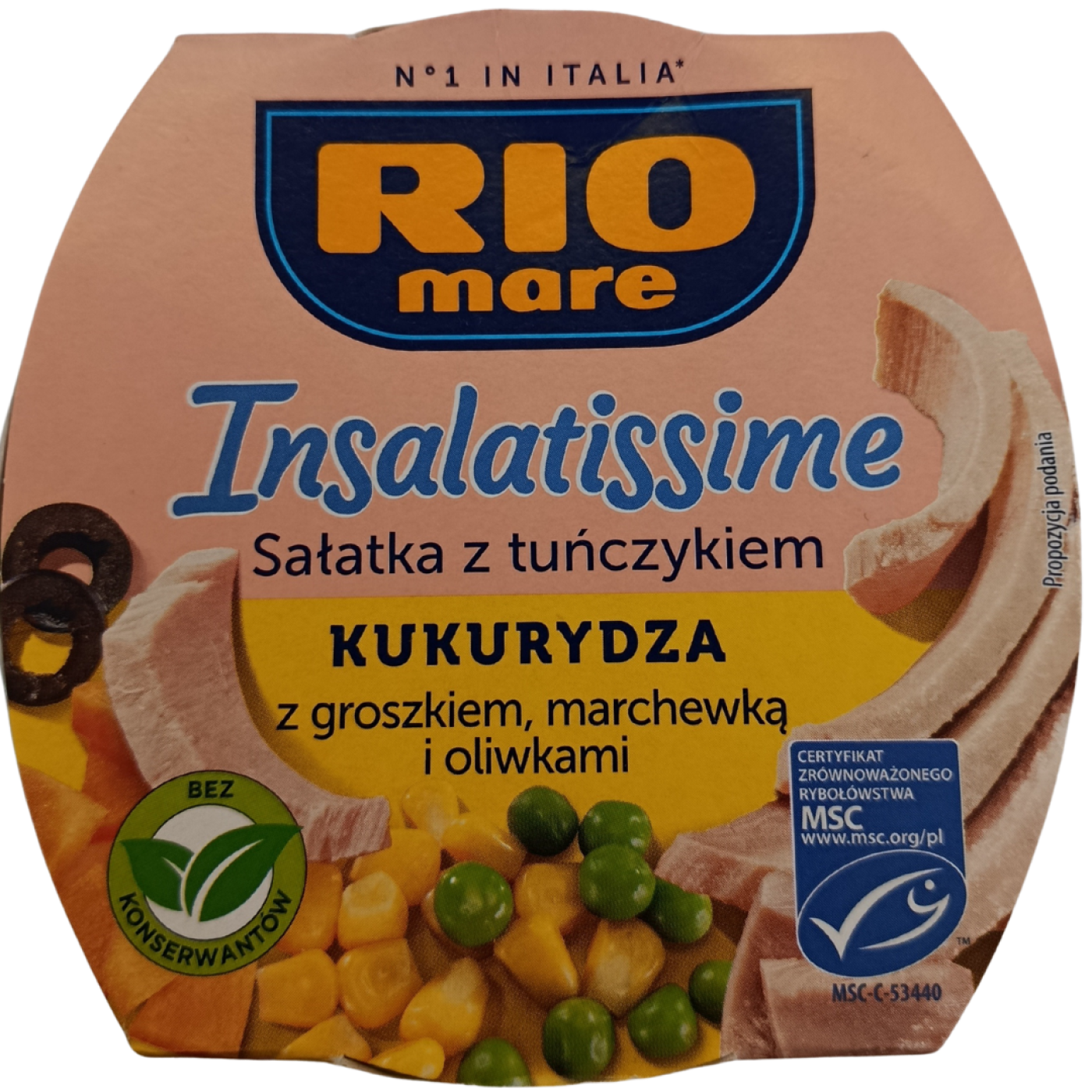 Добре, коли відомі виробники спрощують наше життя, як в випадку з Mais e Tonno Insalatimissime – готовим смачним салатом від Rio Mare. Він виготовлений з тунця, кукурудзи, кукурудзяної олії, моркви, горошку, чорних оливок, лимонного соку і солі. Не містить жодних шкідливих домішок, в тому числі консервантів. Салат з кукурудзи і тунця зручно брати з собою, куди б ви не збирались, наприклад на роботу, прогулянку чи в подорож. Його сміливо можна поєднати з іншими інгредієнтами, гарнірами і навіть смакувати в поєднанні з улюбленим хлібом.