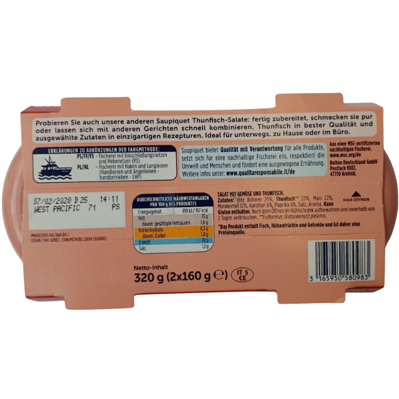 Салат з тунцем Rio Mare Insalatissime Messicana - це поєднання тунця, червоної квасолі, кукурудзи та солодкого перцю у яскравому мексиканському стилі. Тунець є джерелом білка та містить природні омега-3 жирні кислоти. Червона квасоля додає рослинний білок, клітковину та залізо. Кукурудза забезпечує вуглеводи для енергії та містить магній і вітаміни групи B, а перець - природне джерело вітаміну C.