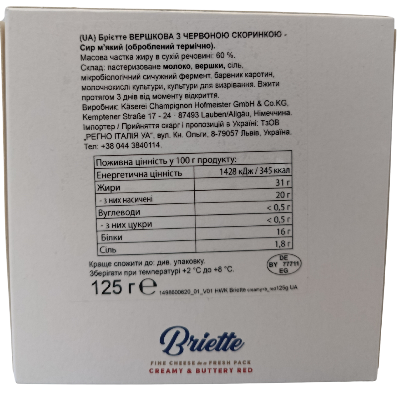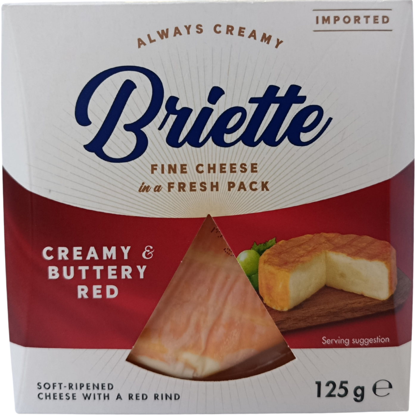 Сир Брієтте Creamy Buttery Red-неймовірно смачний вершковий сир кремового відтінку з характерним грибним ароматом. Скоринка сиру червоного кольору за рахунок добавки паприки. Ідеально поєднується зі скибочками підсмаженого хліба, фруктами, горішками, а також в салатах, випічці та як закуска з білими винами. Також чудово доповнить м'ясні та овочеві закуски.