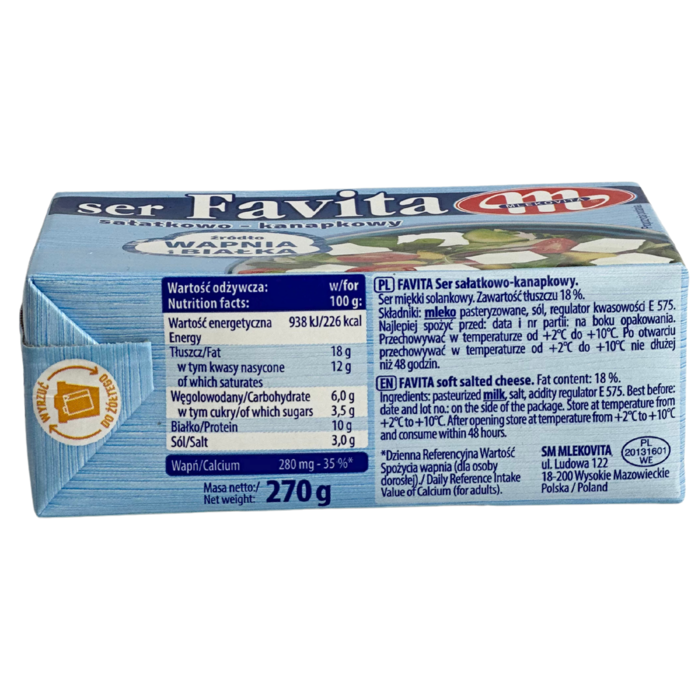 Сир Фета Favita Mlekovita — це класичний м’який сир з насиченим вершково-солоним смаком. Виготовлений із пастеризованого коров’ячого молока, він має приємну крихку текстуру та відмінно доповнює салати, овочеві страви, канапки або випічку.