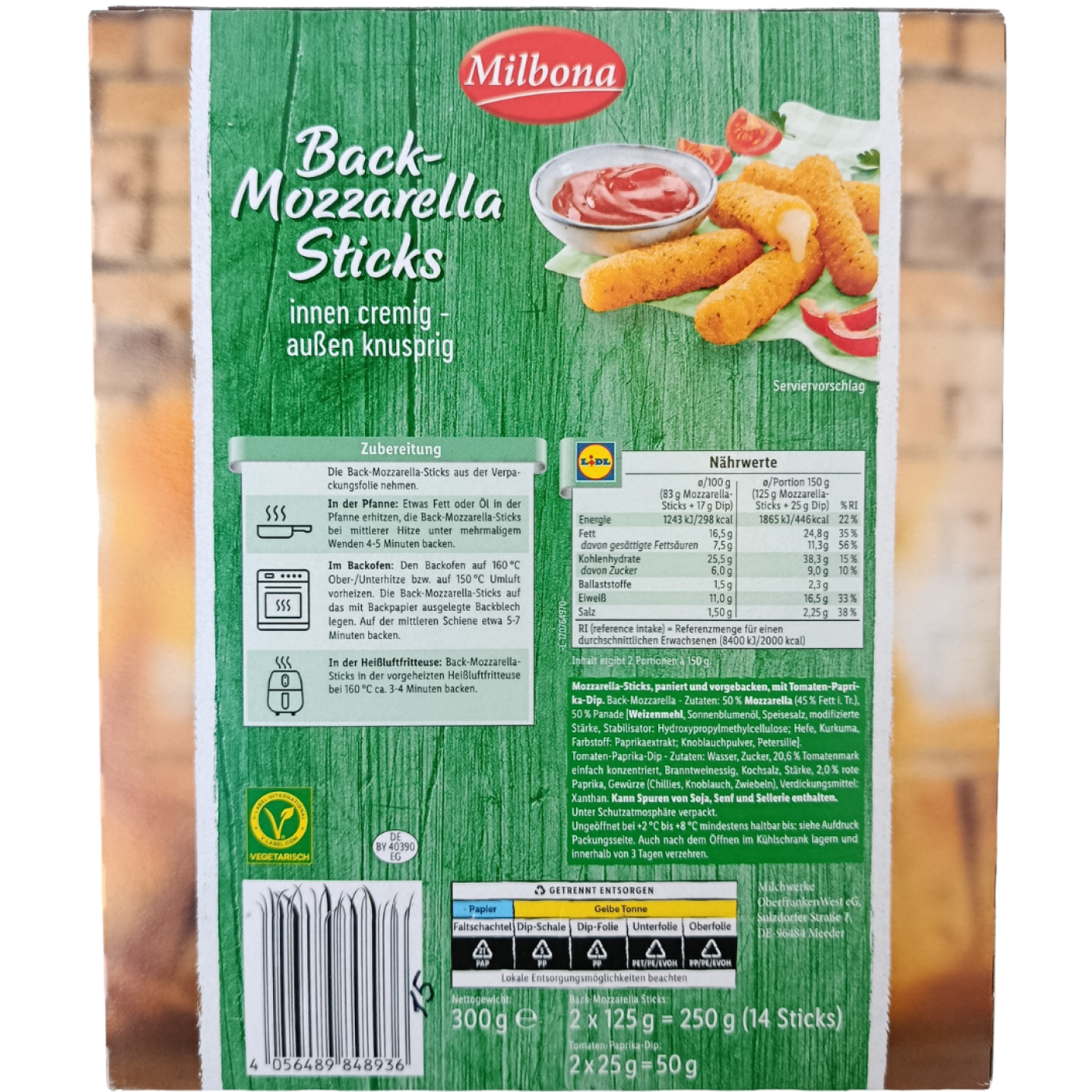 Back Camembert від Milbona – справжній делікатес, адже це чотири шматочки м’якого сиру в паніровці в комплекті з ароматним журавлинним соусом. Він має надзвичайну текстуру, легкий і ненав’язливий смак та аромат. В поєднанні з соусом він особливо смакуватиме та подарує насолоду. Камамбер в паніровці можна готувати в духовці, фритюрниці чи сковороді, час приготування займає від 3 до 15 хвилин, в залежності від методу. В готовому вигляді він має смачну та хрумку скоринку, а всередині м’який і ніжний.