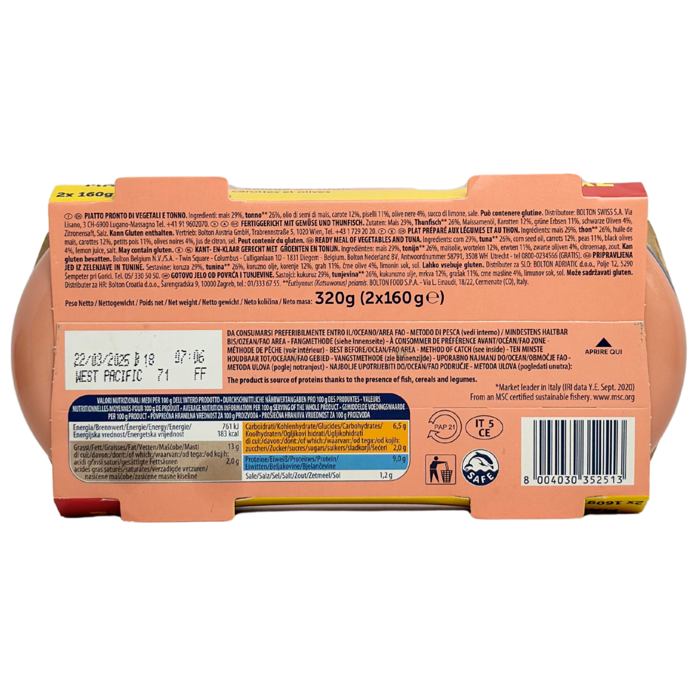 Салат з тунцем, кукурудзою горошком, морквою та оливками Rio Mare Insalatissime Delizia di Mais, Corn 2*160g - це готовий до вживання смачний та корисний салат, який містить тунця, кукурудзу, горошок, моркву та оливки. Ідеальний вибір для швидкого перекусу чи легкого обіду. Цей салат зібрав у собі всі найкращі інгредієнти, що забезпечують баланс смаку та користі. Упаковка містить два пакети, що робить його зручним для вживання в будь-який час. Без додаткових зусиль ви отримуєте смачну страву з багатим складом та поживними властивостями.
