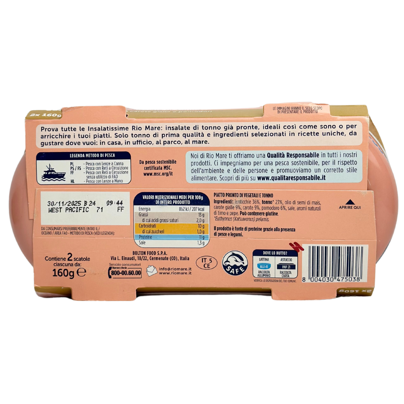 Салат з тунцем, сочевицею, морквою і помідорами Rio Mare Insalatissime Lenticchie 2*160 г - це смачний та корисний готовий салат, який поєднує в собі високоякісне консервоване філе тунця, поживну сочевицю, свіжу моркву та соковиті помідори. Тунець у складі салату є чудовим джерелом білка та омега-3 жирних кислот, що сприяють зміцненню серцево-судинної системи та загальному здоров’ю. Сочевиця додає салату рослинних білків і клітковини, що покращує травлення та підтримує стабільний рівень цукру в крові. Морква й помідори багаті на вітаміни A, C та антиоксиданти, які підтримують здоров'я шкіри, зору та імунної системи.