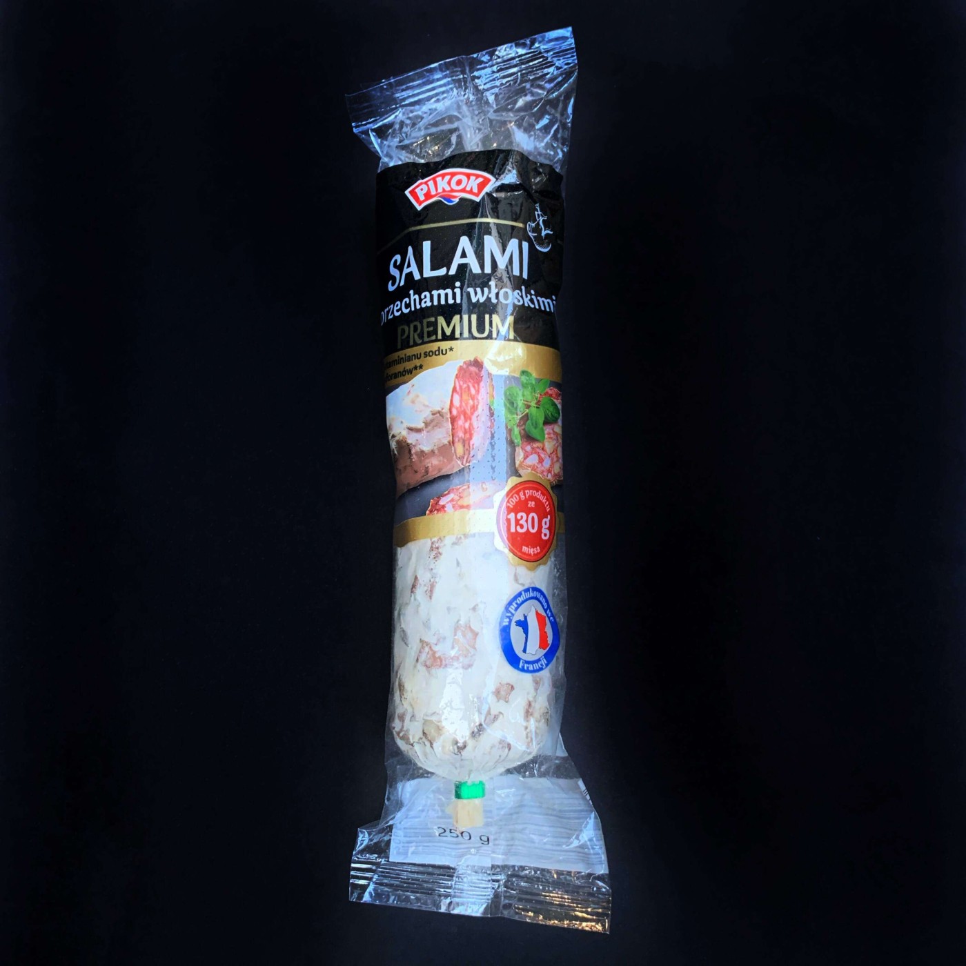 Salami z orzechami wloskimi від Pikok можна назвати оригінальним французьким делікатесом, виготовленим за традиційним рецептом. Салямі виготовлена з високоякісної свинини, містить шматочки волоського горіху (грецького) та спеції, а зверху вкрита природньою пліснявою. Вона має м’який та злегка солонуватий смак, а горіхи дарують цікаву смакову нотку. Можна впевнено казати про ідеальне поєднання свіжого якісного м’яса та корисних хрумких горіхів.