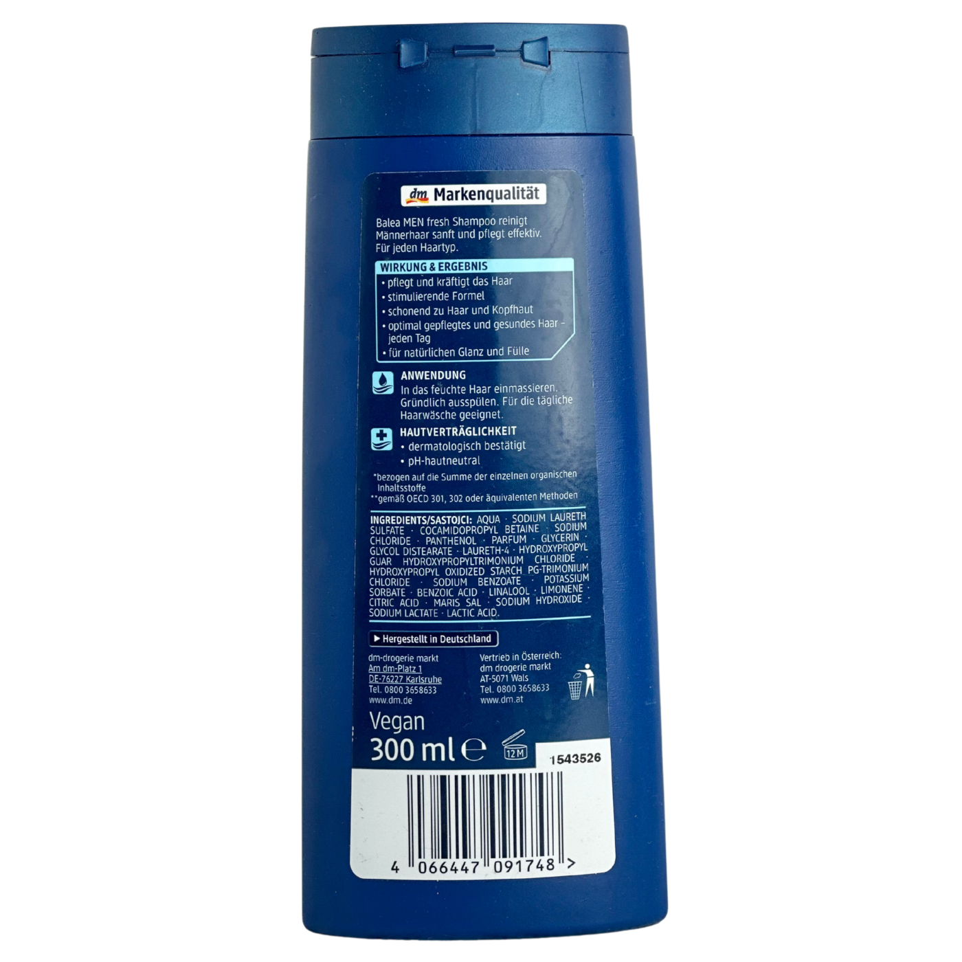 Шампунь Fresh Balea Men - освіжаючий засіб для догляду за чоловічим волоссям та шкірою голови. Він ніжно очищує, видаляє надлишковий жир і додаткові забруднення, залишаючи волосся свіжим та доглянутим. Формула забезпечує приємне відчуття чистоти й комфорту після кожного миття та підходить для щоденного використання.
