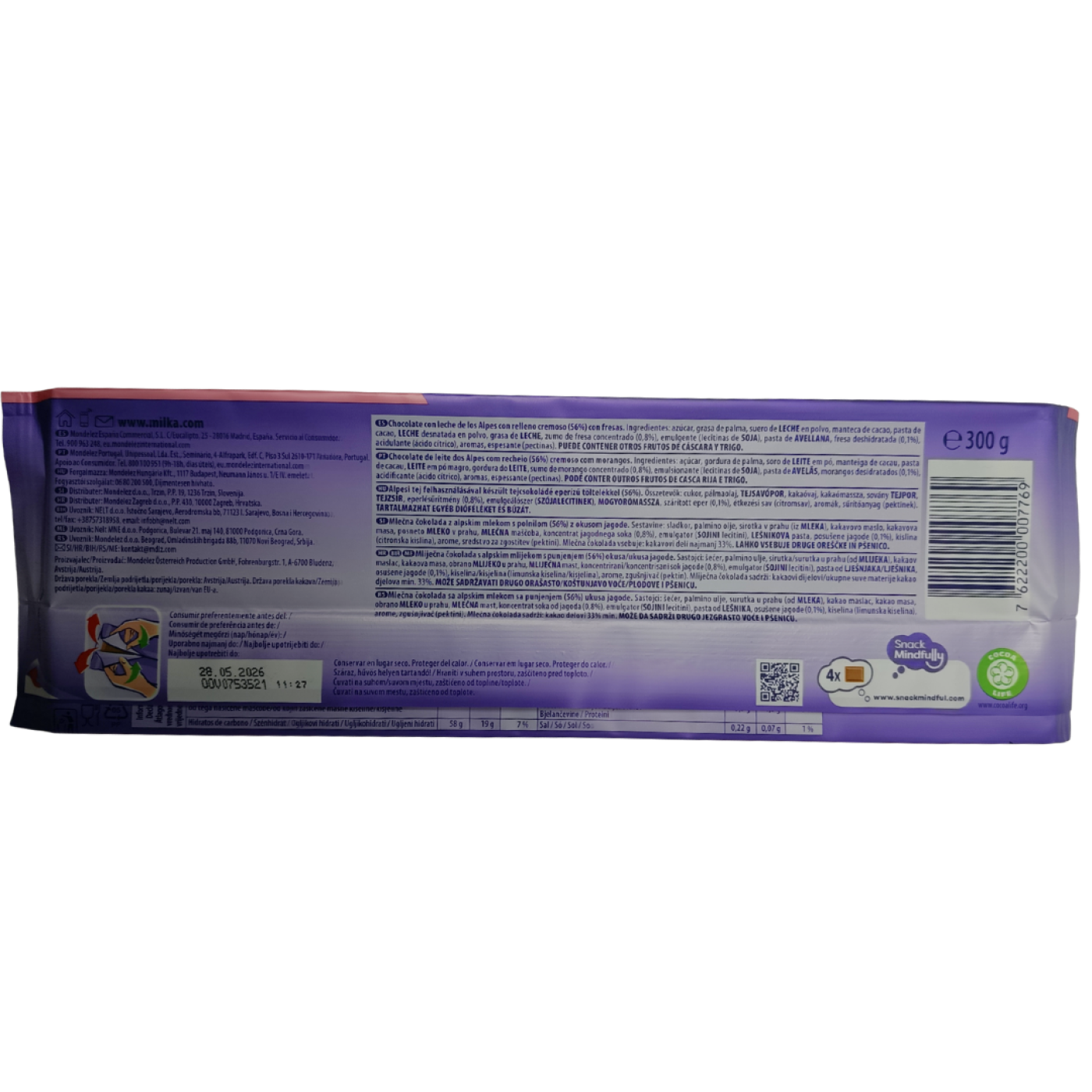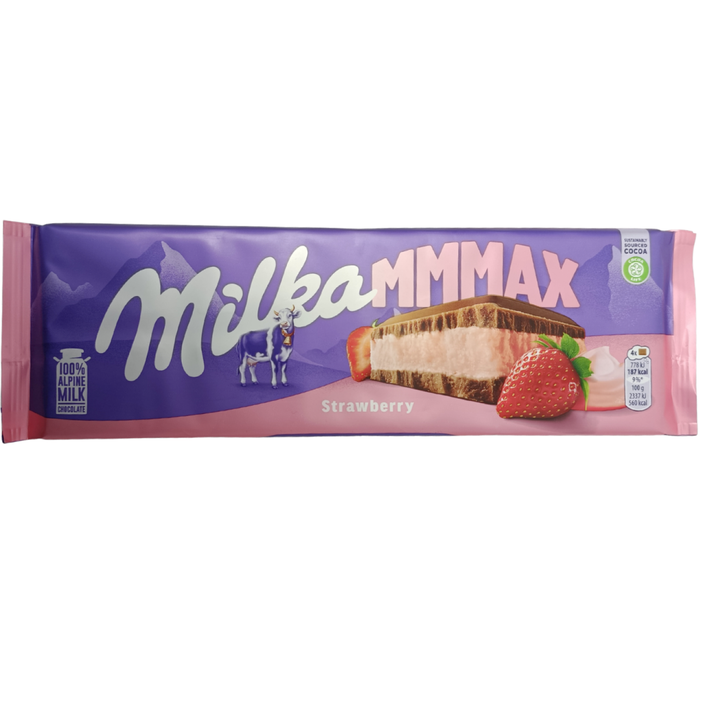 Молочного шоколаду від Мілка точно ніколи не буває багато! Так подумав і виробник, запропонувавши величезну плитку вагою 300 г. Саме в Mmmax Strawberry ніжний молочний шоколад вдало поєднався з несамовитою полуничною начинкою. Насолода забезпечена, а з нею і чудовий настрій, який покращиться вже після першого шматочку смаколику.