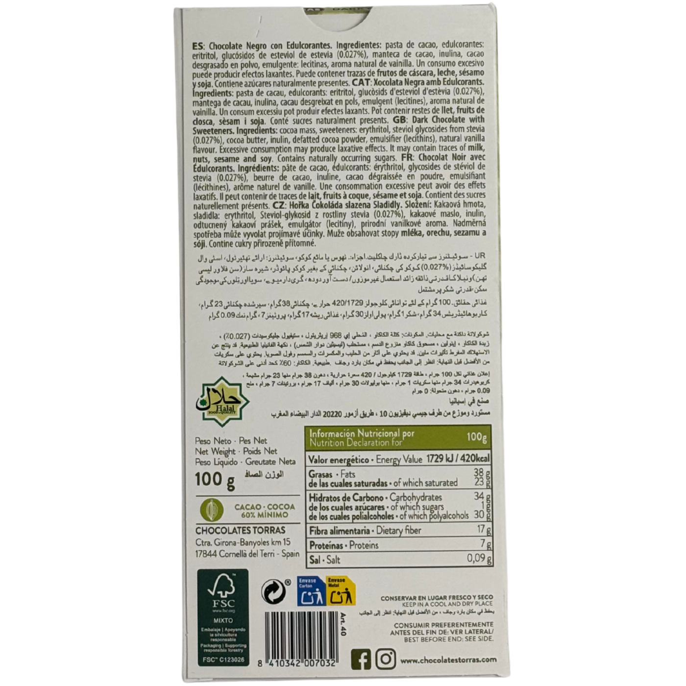 Шоколад темний без цукру 60% Dark Stevia Torras 100g