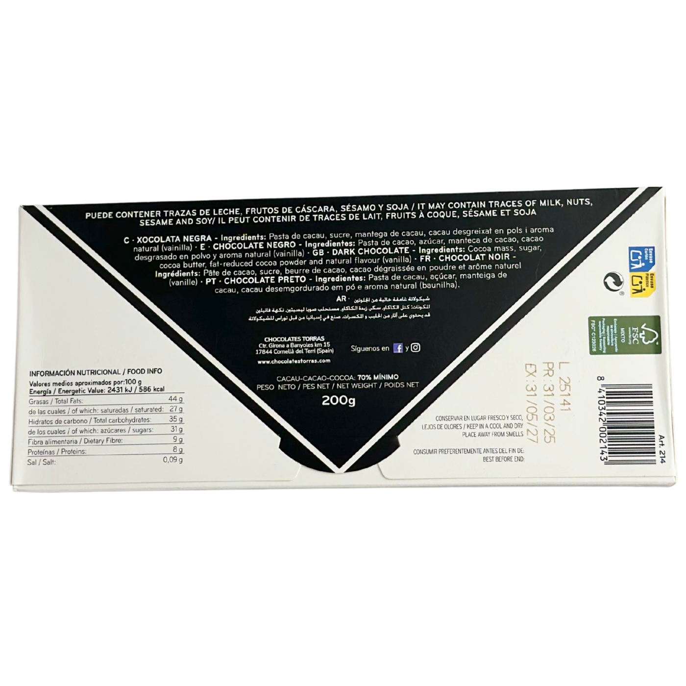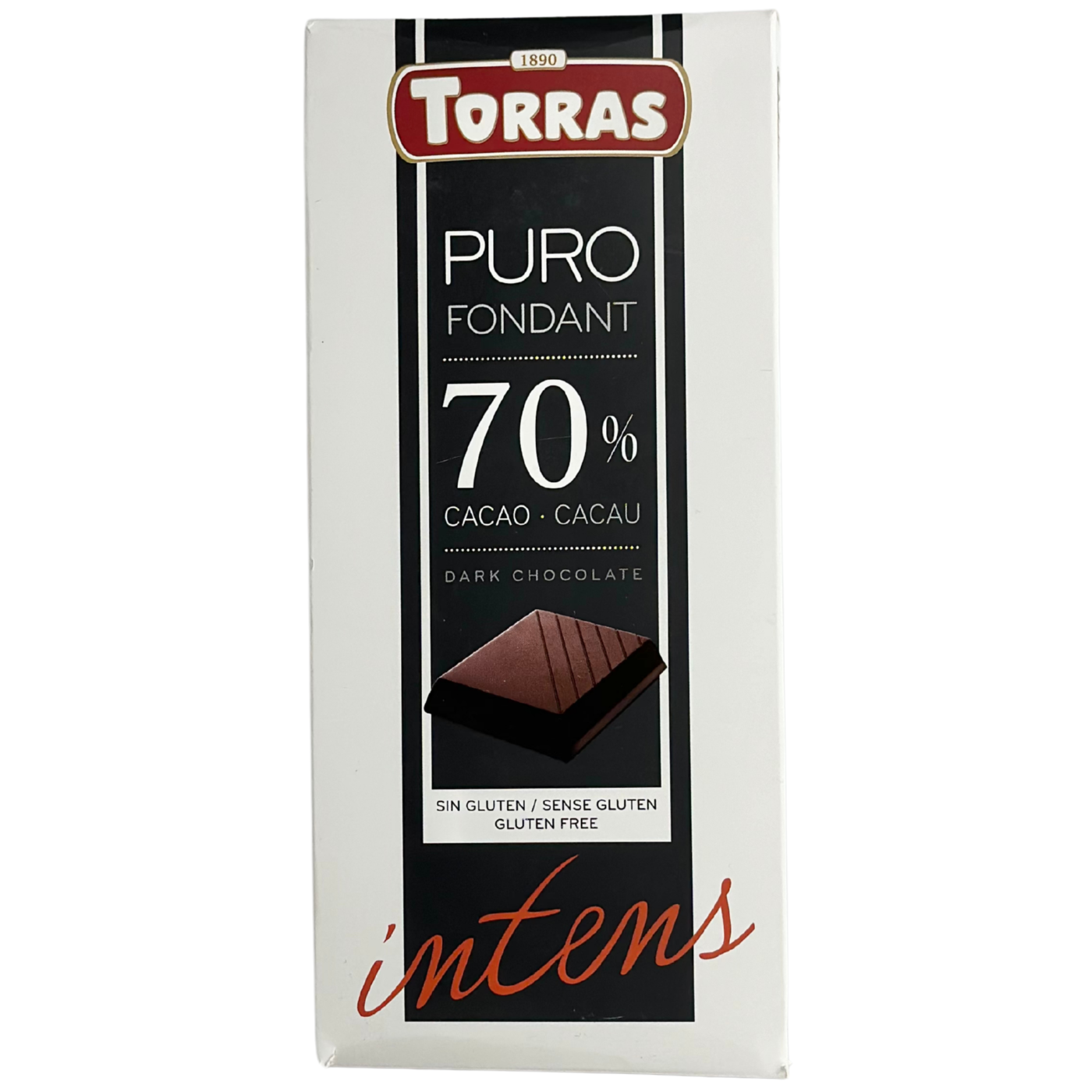 Torras 70% cacao Puro fondant – шоколад з Іспанії з насиченим смаком та приємною ванільною ноткою. Він має особливий інтенсивний смак, адже містить мінімум 70% какао, смакуватиме усім солодкоїжкам, які цінують справді якісне солодке.