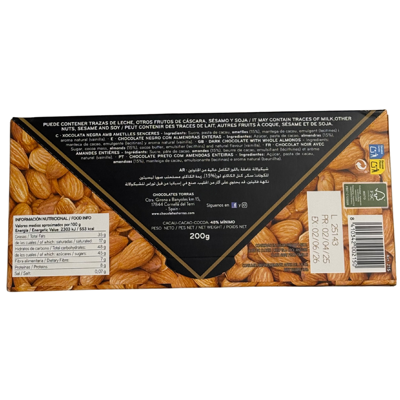 Чорний шоколад з цільним мигдалем – це ідеальне поєднання, яке припаде до смаку усім поціновувачам солодкого. Whole Almonds від Torras подарує справжню насолоду, в шоколаді міститься цілий мигдаль, який відомий своїми корисними речовинами, він підтримує імунітет та вважається джерелом енергії.