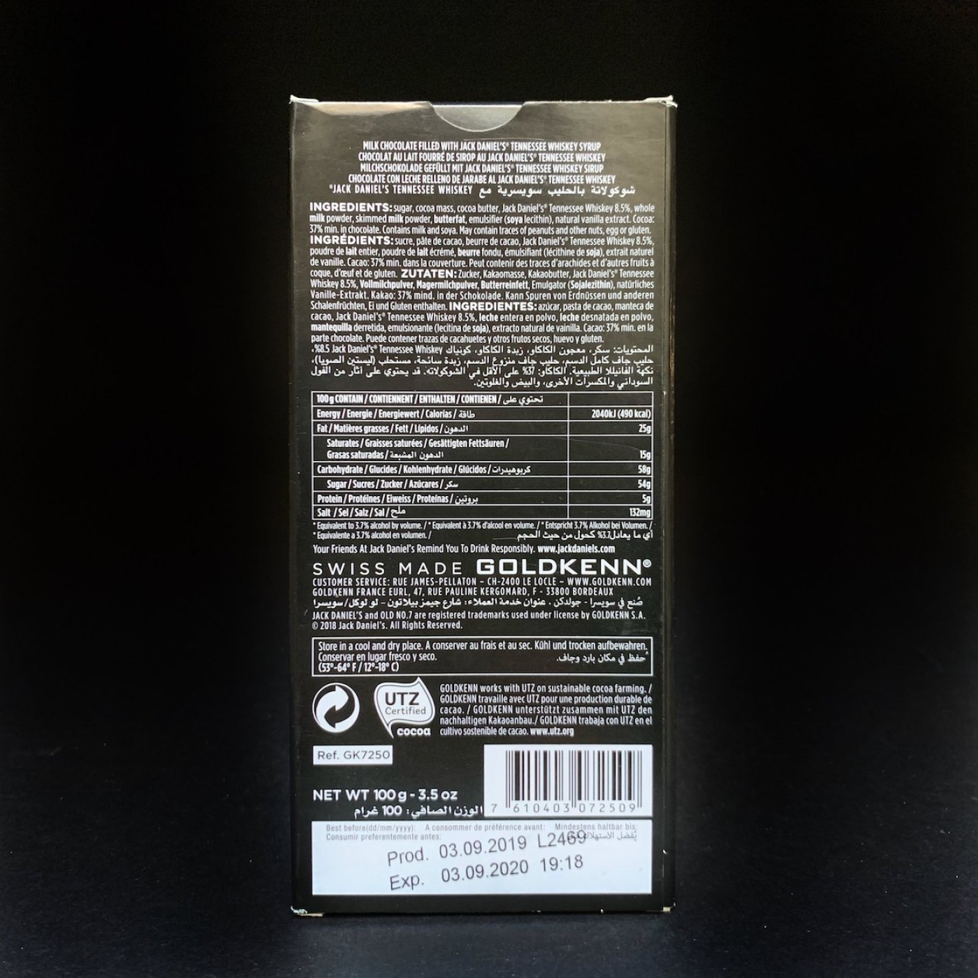 Поціновувачі якісного віскі неодмінно оцінять смак молочного шоколаду Jack Daniel’s Jennessee Whiskey, адже він містить начинку з відомим напоєм (8,5%). Шоколад виготовлений в Швейцарії, кожен справжній поціновувач оригінальних смаколиків буде в захваті від особливого поєднання смаків.
