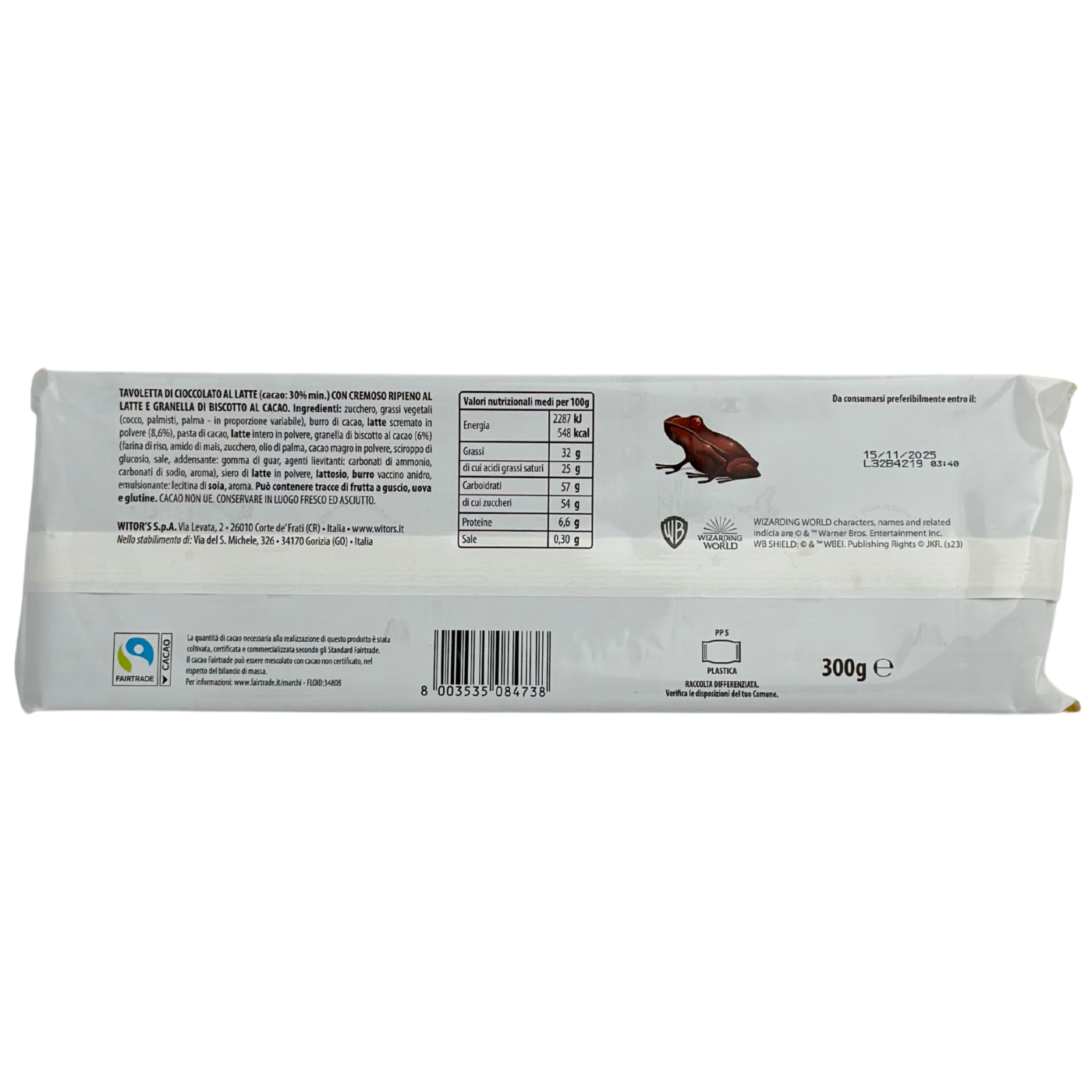 Молочний шоколад з вершково-молочною начинкою та какао-печивом Harry Potter Wizarding World Witor's 300g - це неповторний та магічний шоколад який поєднює в собі ніжний смак молочного шоколаду та хрусткі крихти печива з молочної начинки. Така упаковка в стилі Harry Pottera миттєво привертає увагу будь якого поціновувача світу чарівних пригод. А на кожній плитці шоколаду зображена магічна жабка яка робить цей смаколик надзвичайно чарівним. З таким подарунком ви точно здивуєте дітей.