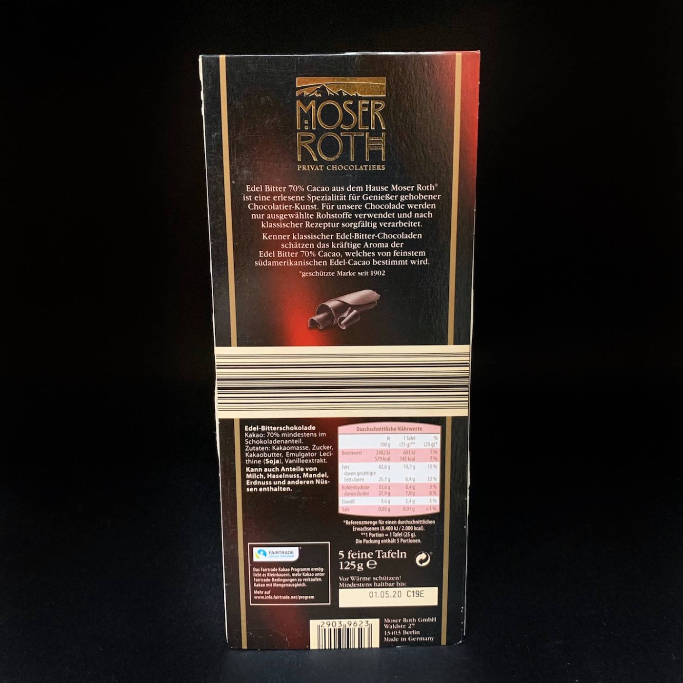 Moser Roth 70% Cacao – справжня знахідка для поціновувачів чорного шоколаду з насиченим смаком та ароматом. В складі виключно якісні інгредієнти, а сам продукт виготовлений німецьким виробником, який пропонує відбірні солодощі.
