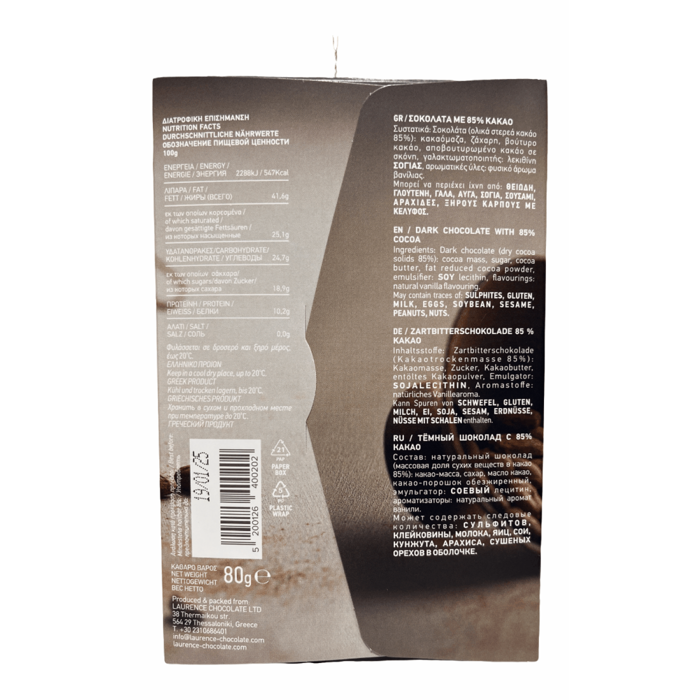 Неперевершений преміальний шоколад ручної роботи від славнозвісного грецького виробника Laurence. Виготовляють шоколад з кувертюру із темного шоколаду, в якому сухий залишок какао становить 85%. Грецькі майстри шоколадного мистецтва створили ідеальний преміум смак, який зацінять всі любителі темого шоколаду. Чудовий дизайн робить шоколад красивим презентом для близьких чи просто красивою і смачною подякою.