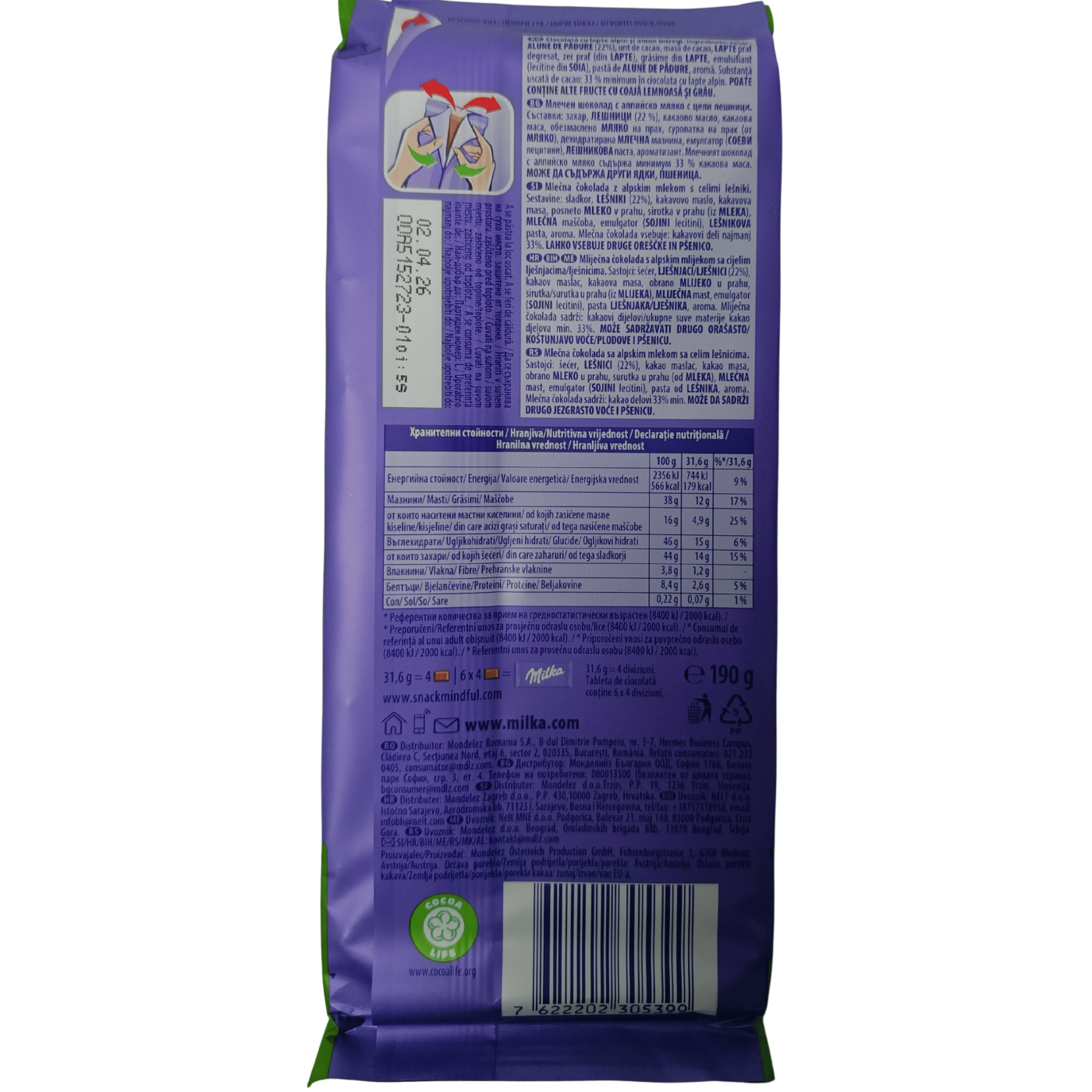 У цій плитці класична кремова солодкість молочного шоколаду Milka поєднується з хрусткими шматочками фундука, що робить кожен шматочок багатим за смаковими відчуттями — ідеальним як для перекусу, так і для солодкого задоволення з кавою чи чаєм.