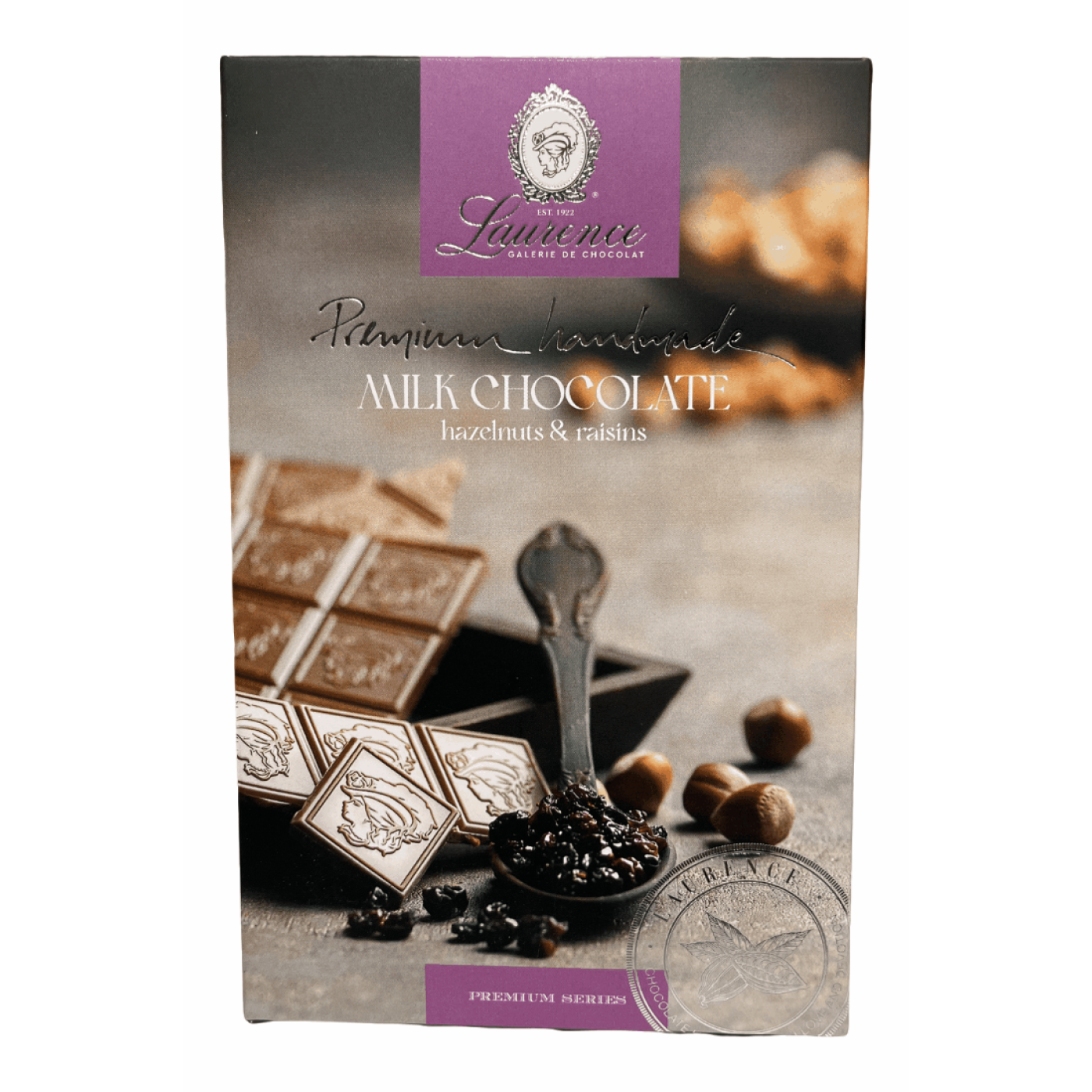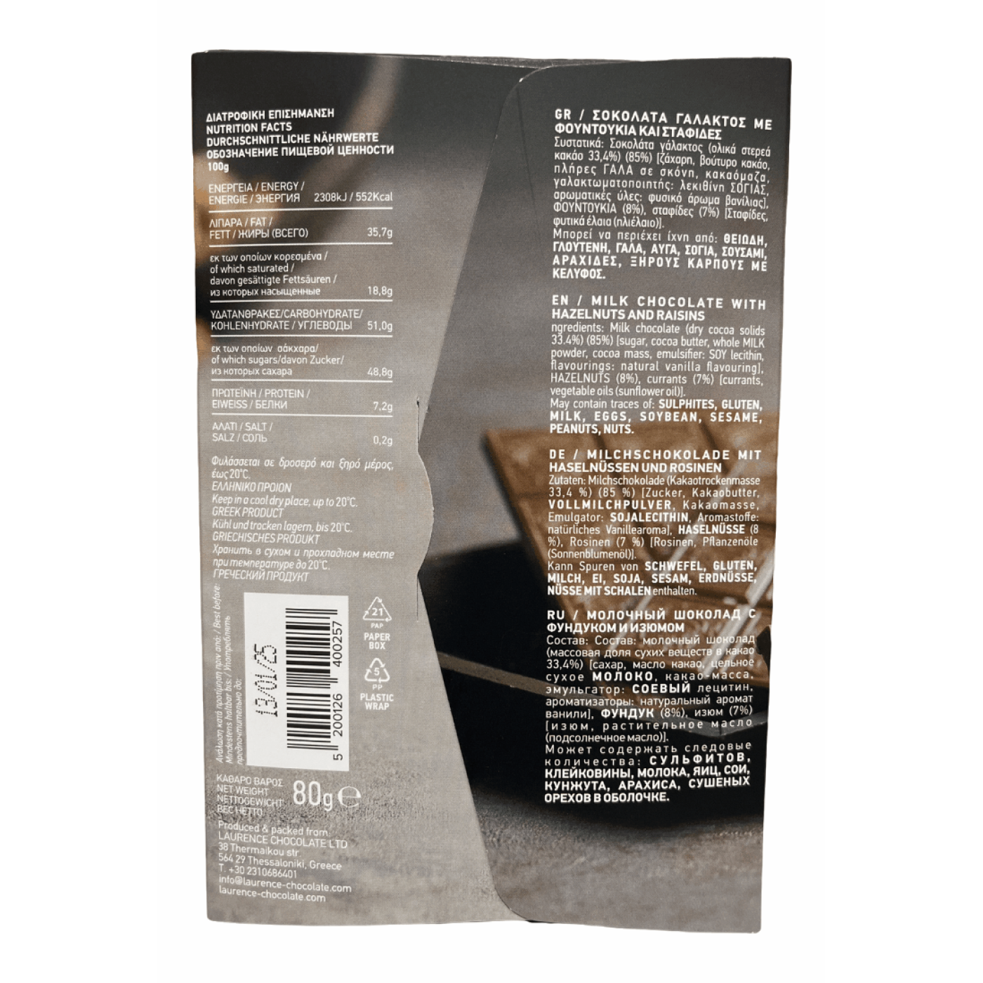 Преміальний молочний грецький шоколад ручної роботи з фундуком та родзинками підійде всім любителям солодощів. Майстри з кондитерської Laurence створили одне з найкращих поєднань молочний шоколад, фундук та родзинки. Унікальна, вишукана упаковка та чудовий смак м'якого та ніжного шоколаду з хрумкими гріхами і кисло-солодкими родзинками - це ідеальний подарунок, презент чи подяка.