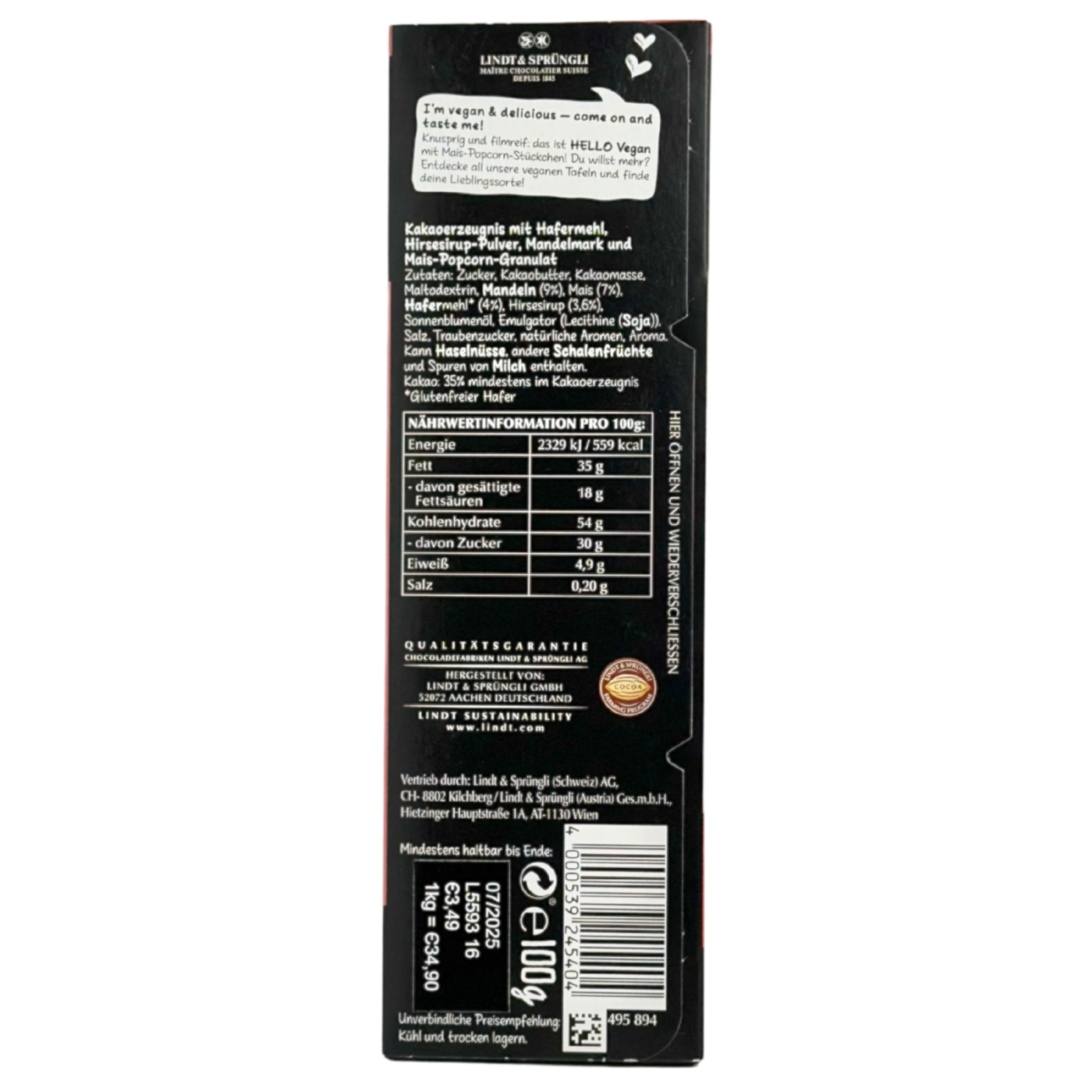 Шоколад молочний з соленим і солодким попкорном Hello Lindt Vegan Sweet & Salty Popcorn — це вибух смаку в кожному шматочку! М’який, вершковий молочний шоколад поєднується з хрумким попкорном із нотками солі та карамелі, створюючи ідеальну гармонію солодкого та солоного. Веганська рецептура дозволяє насолоджуватися десертом без молочних продуктів, а цікава текстура попкорну робить кожен шматочок неймовірно захопливим. Ідеальний вибір для ласунів, які люблять поєднання класики та несподіваних смакових контрастів.