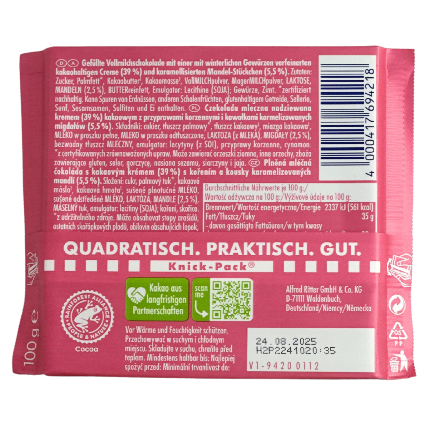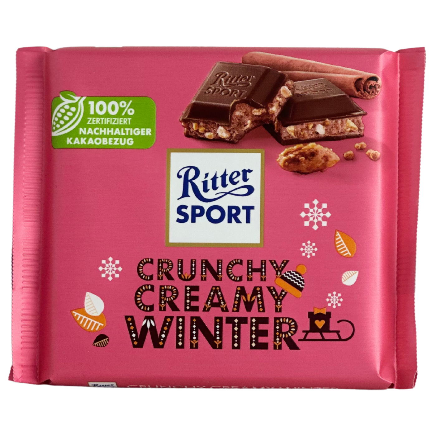 Шоколад Ritter Sport Crunchy Creamy Winter- це молочний шоколад з зимовими прянощами, який створює теплу атмосферу затишку. Він поєднує в собі ніжну кремову текстуру та хрусткі шматочки, а також аромати кориці, імбиру та інших традиційних зимових спецій. Ідеальний для холодної пори року, цей шоколад стане чудовим доповненням до святкового настрою або затишного вечора вдома!