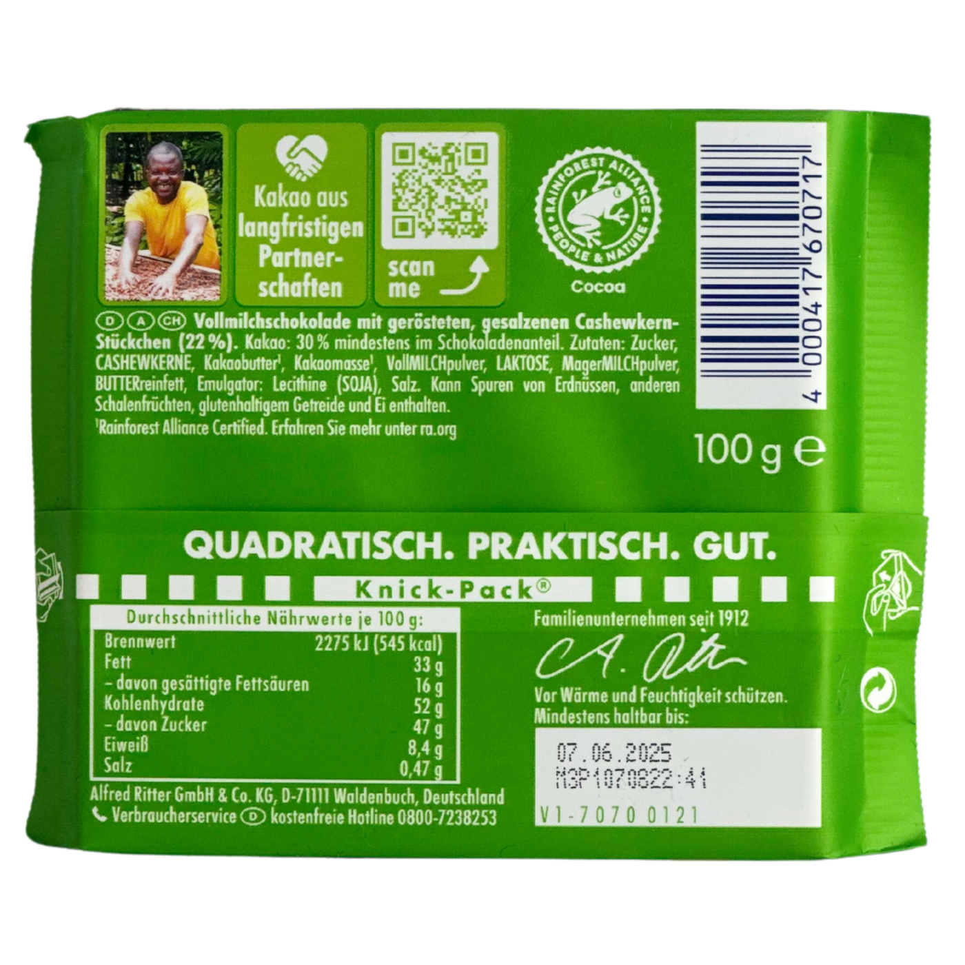 Спробуйте новинку від популярного німецького виробника Ritter Sport – молочний шоколад з цільним кеш’ю. Смак надзвичайно ніжний і молочний, адже плитку виготовляють з найкращих інгредієнтів, а цільні горіхи додають хрусткості та користі.