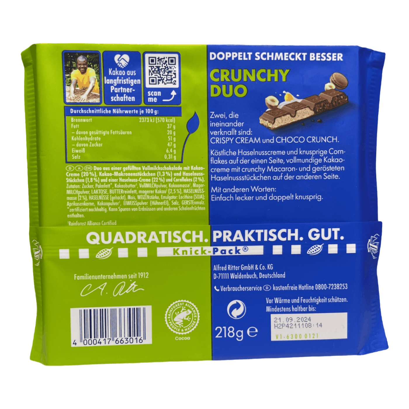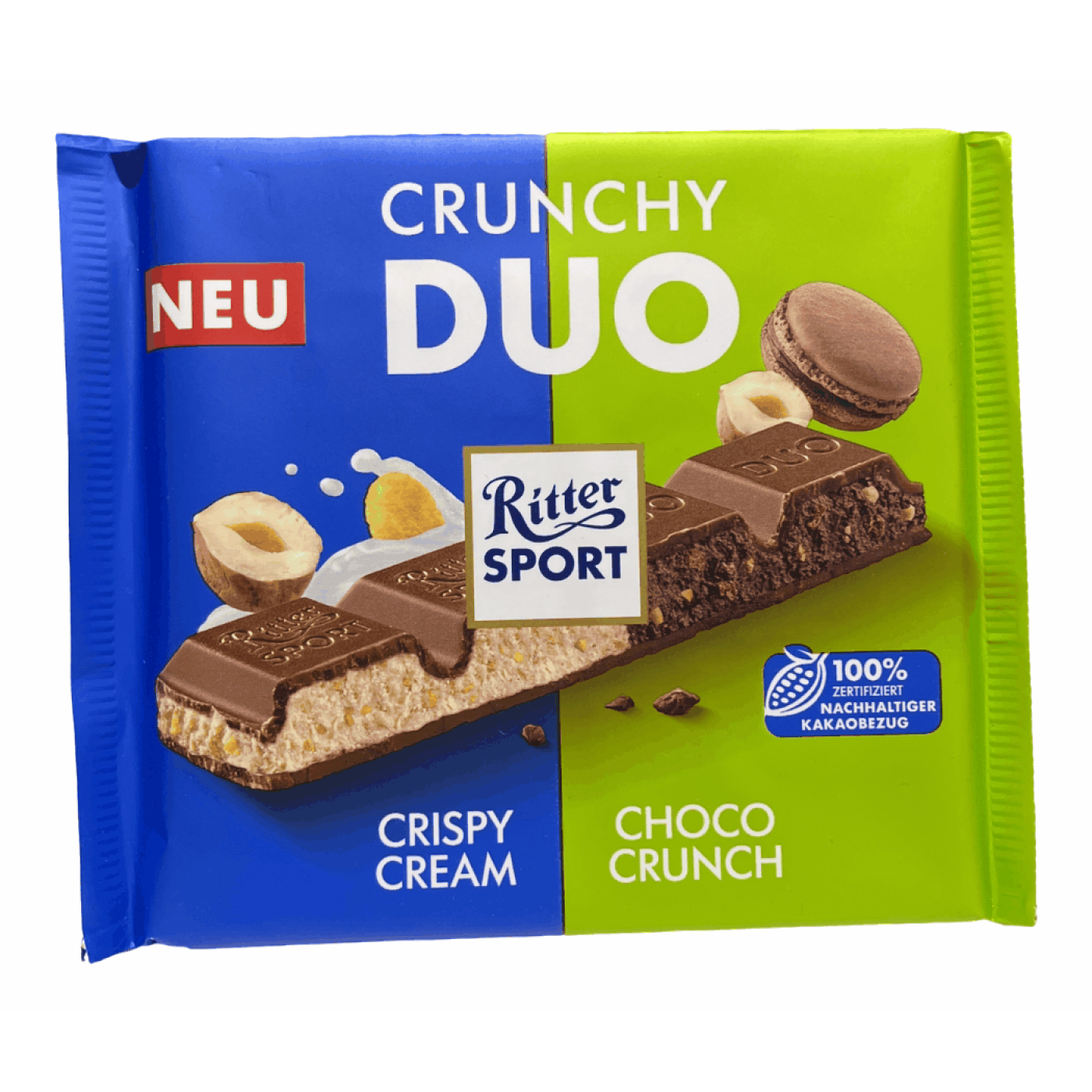 Шоколад Ritter Sport Crunchy Duo молочний з горіховим кремом кукурудзяними пластівцями і з какао кремом і шматочками горіхв 218g