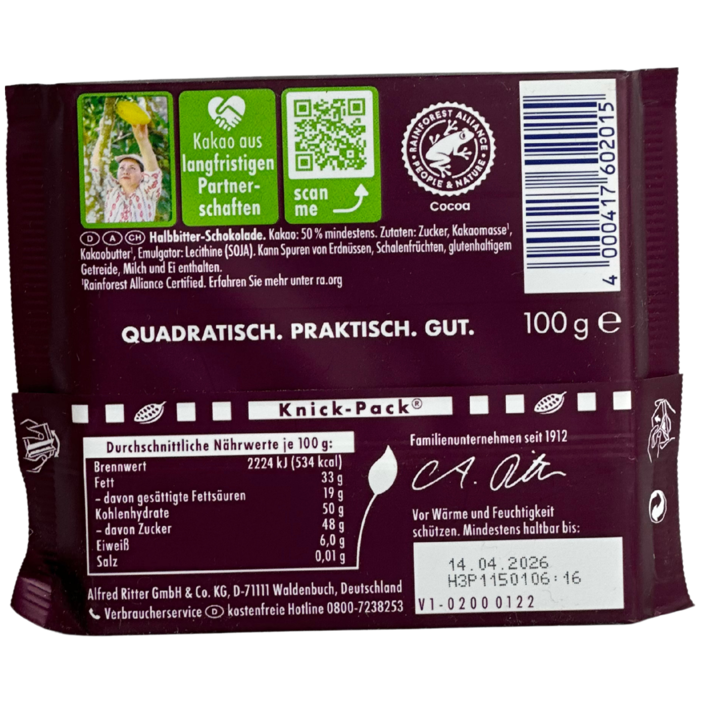 Шоколад Ritter Sport Halbbitter- це темний шоколад з вмістом 50% какао, що робить його ідеальним вибором для любителів гіркого шоколаду. Він має насичений смак з легкими нотами гіркоти, що чудово балансує солодкість. Упаковка 100 г зручна для насолоди як в самотності, так і в компанії. Якщо ти цінуєш якісний темний шоколад, Ritter Sport Halbbitter буде відмінним вибором!