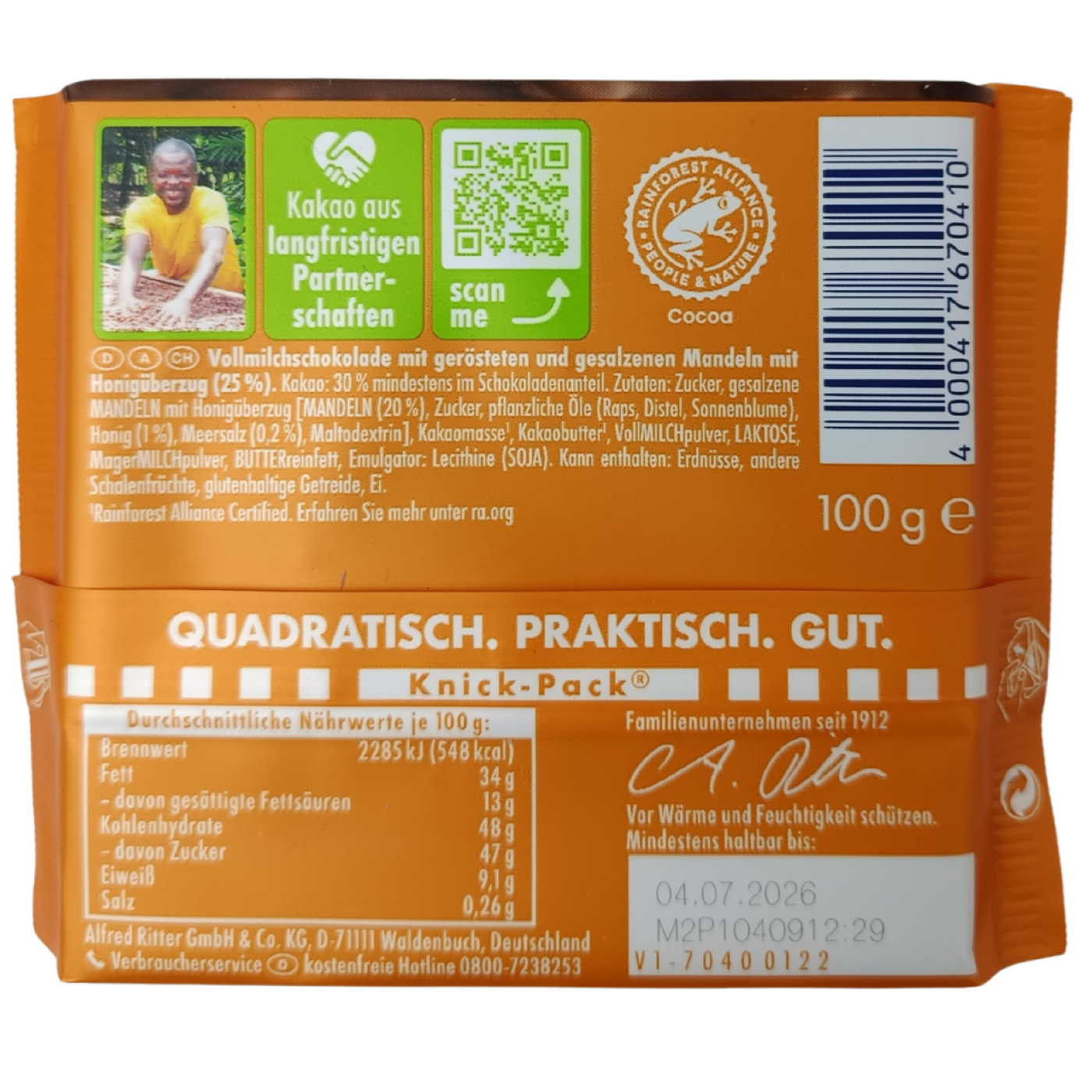 Шоколад Ritter Sport Honing-Salz-Mandel молочний з мигдалем та морською сіллю 100g