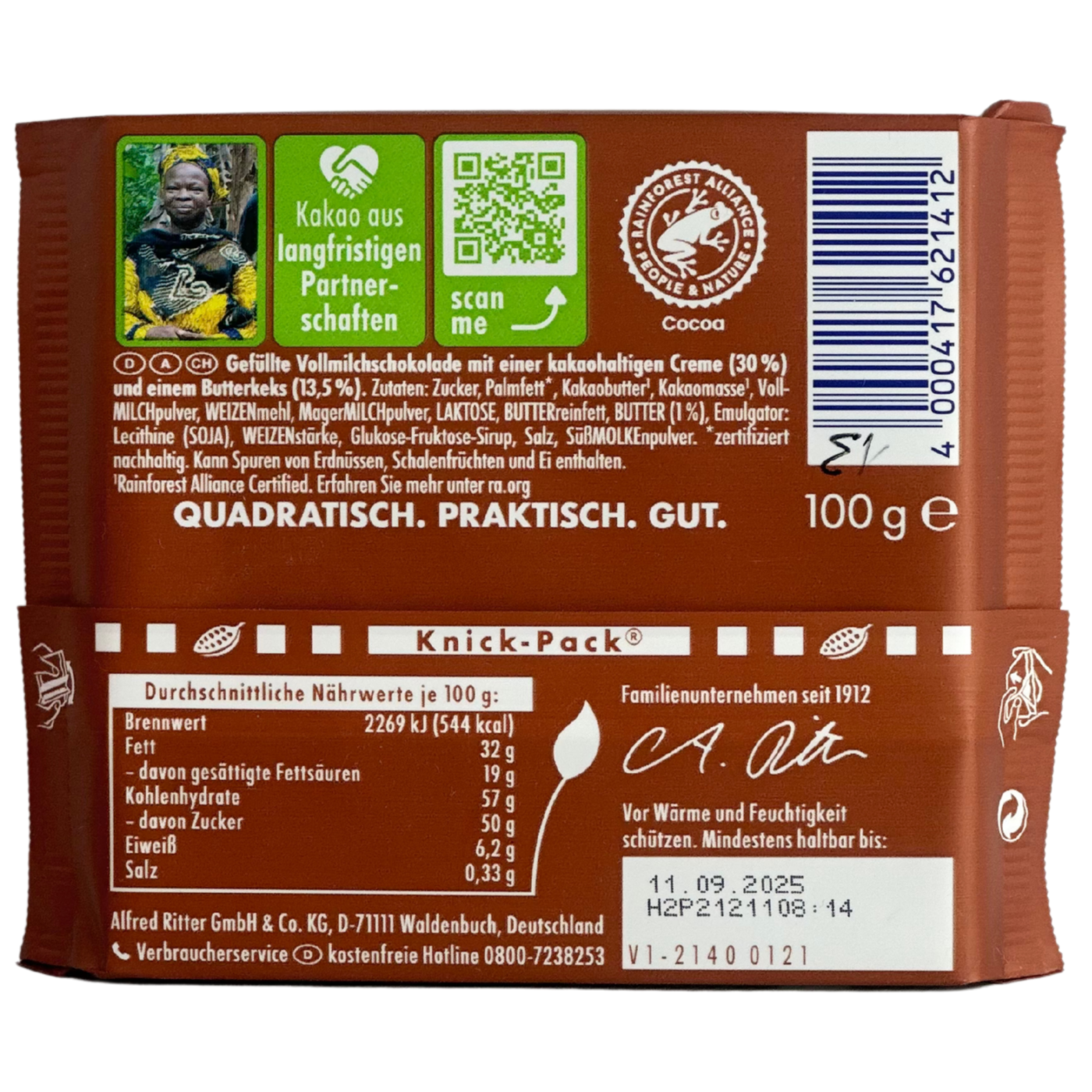 Улюбленець солодкоїжок – шоколад Ritter Sport Knusperkeks з хрустким печивом. Його можна назвати справді унікальним, тому що смачний та ніжний шоколад поєднується з печивом на основі вершкового масла в одному продукті, а це справді дуже смачно!