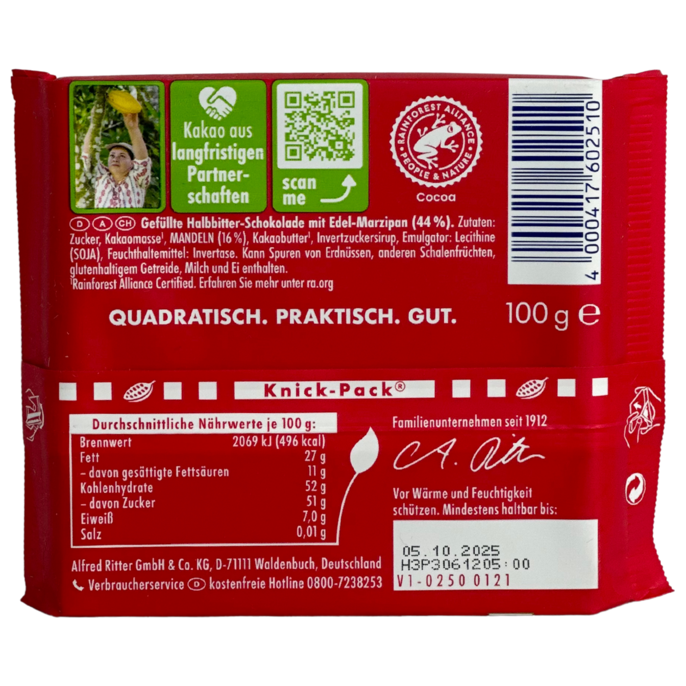 Шоколад Ritter Sport Marzipan- це комбінація темного шоколаду та ніжного марципану. Цей продукт відрізняється насиченим смаком темного шоколаду, що підкреслює солодкість і аромат марципану. Він має класичну квадратну форму Ritter Sport, що робить його зручним для порційного вживання. Якщо ти любиш поєднання шоколаду та горіхового смаку, це може бути чудовим вибором для тебе!