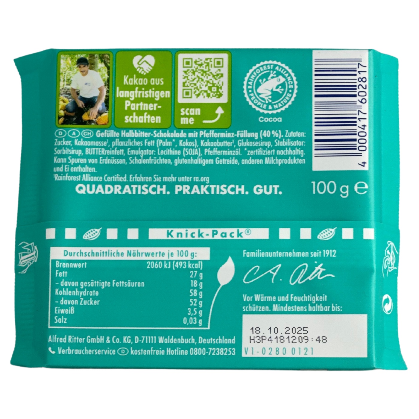 Шоколад Ritter Sport Pfefferminz- це молочний шоколад з начинкою з м’яти. Він має приємний освіжаючий смак, поєднуючи солодкість шоколаду з легкою пряністю м’яти. Цей шоколад часто підходить для тих, хто любить незвичайні поєднання смаків. Якщо ти любиш шоколад з м’ятними нотами, цей варіант точно варто спробувати!